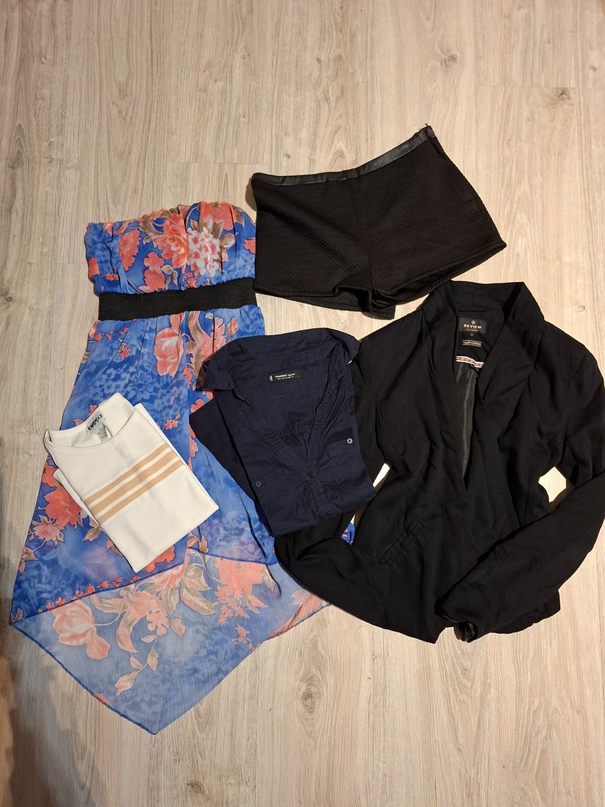 Balík v dobrom nosenom stave. Biele šortky značky Champion veľkosť S, čierne šortky veľkosť L, biela sukňa England značky Pilot veľkosť píše 10(S), riflova sukňa veľkosť M, povedala by som že aj S ...