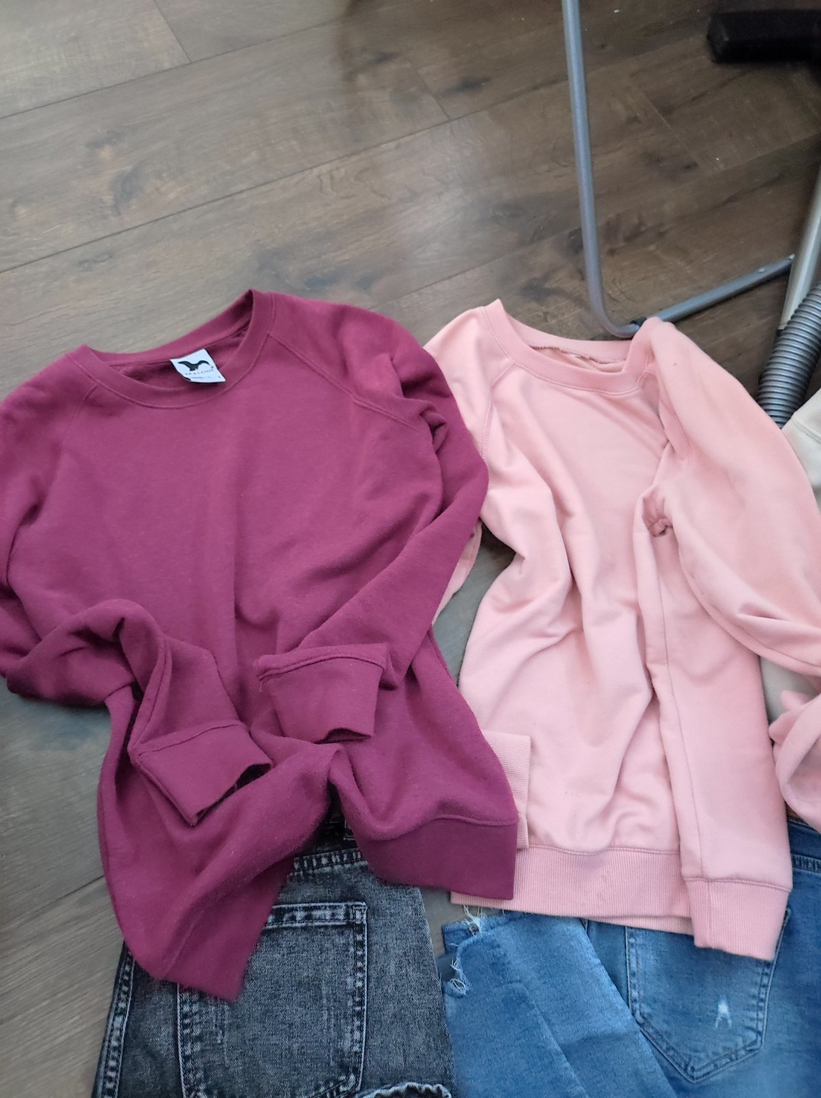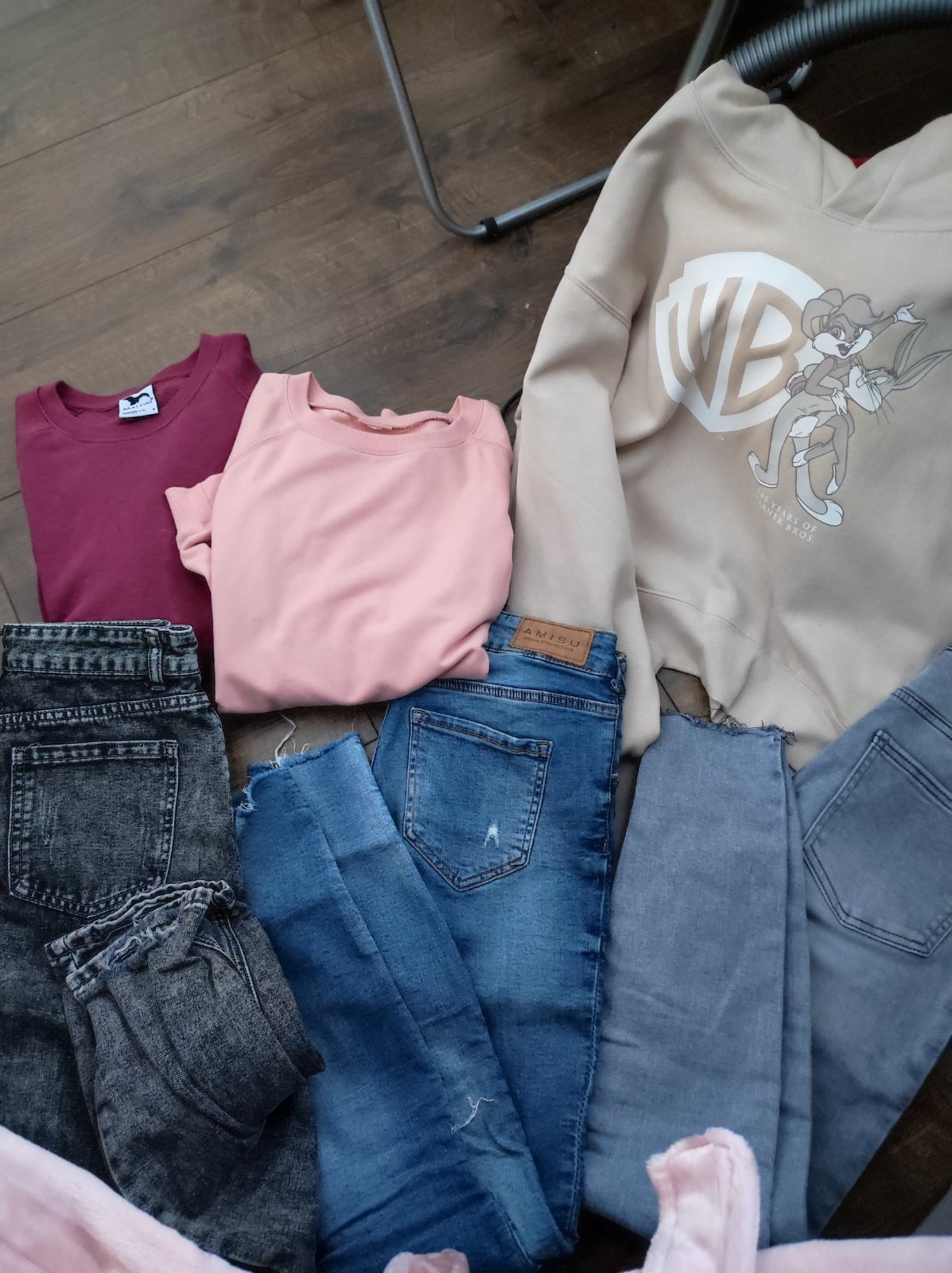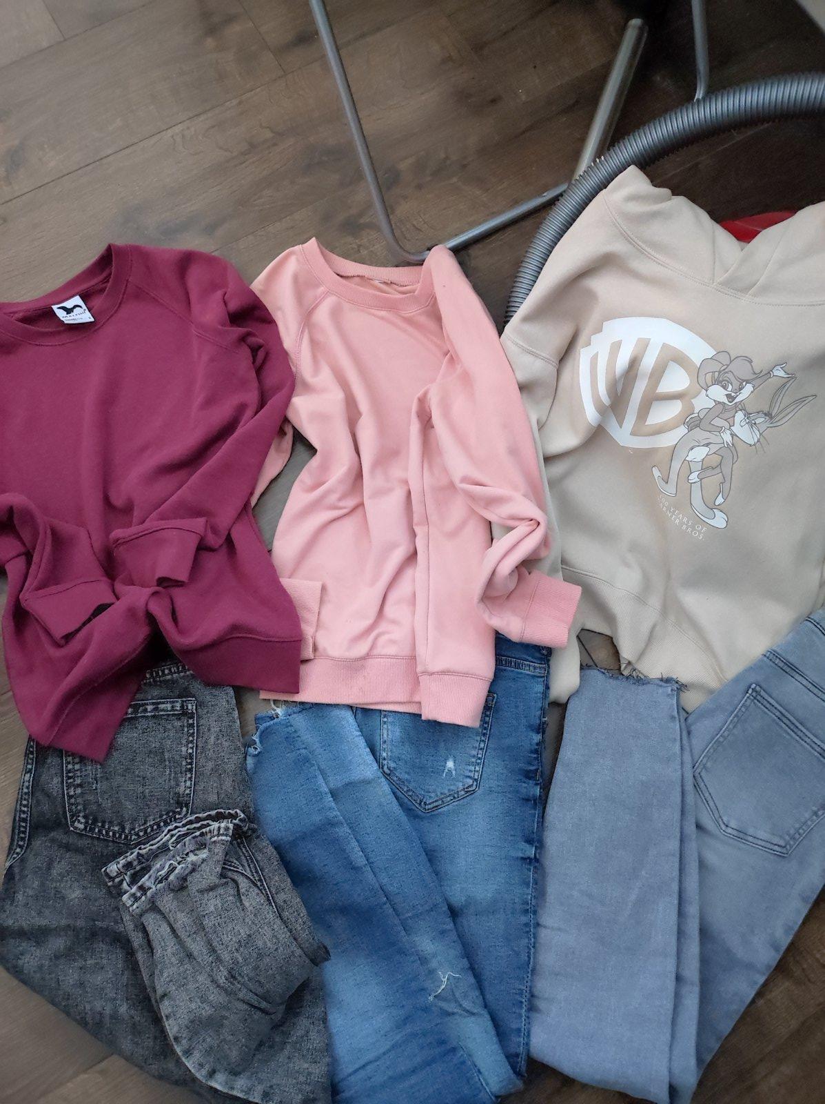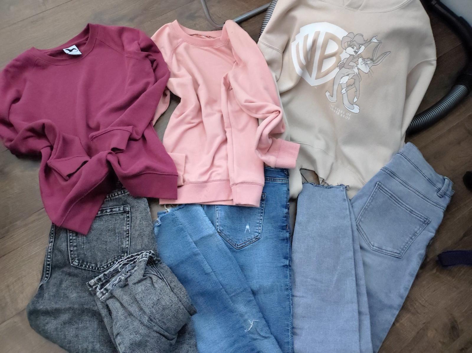 posuvam veci v peknom stave bez poškodenia malo nosene ako nové. velkost padne menšie M. alebo S/M. béžová mikina je kratšieho strihu.Sú tam 3 rifle. skinny a jedny boyfriend. a 2mikiny bez kapucne cez hlavu a jedna s kapucnou. pošta 3€ cez packetu. cena s poštou 14€