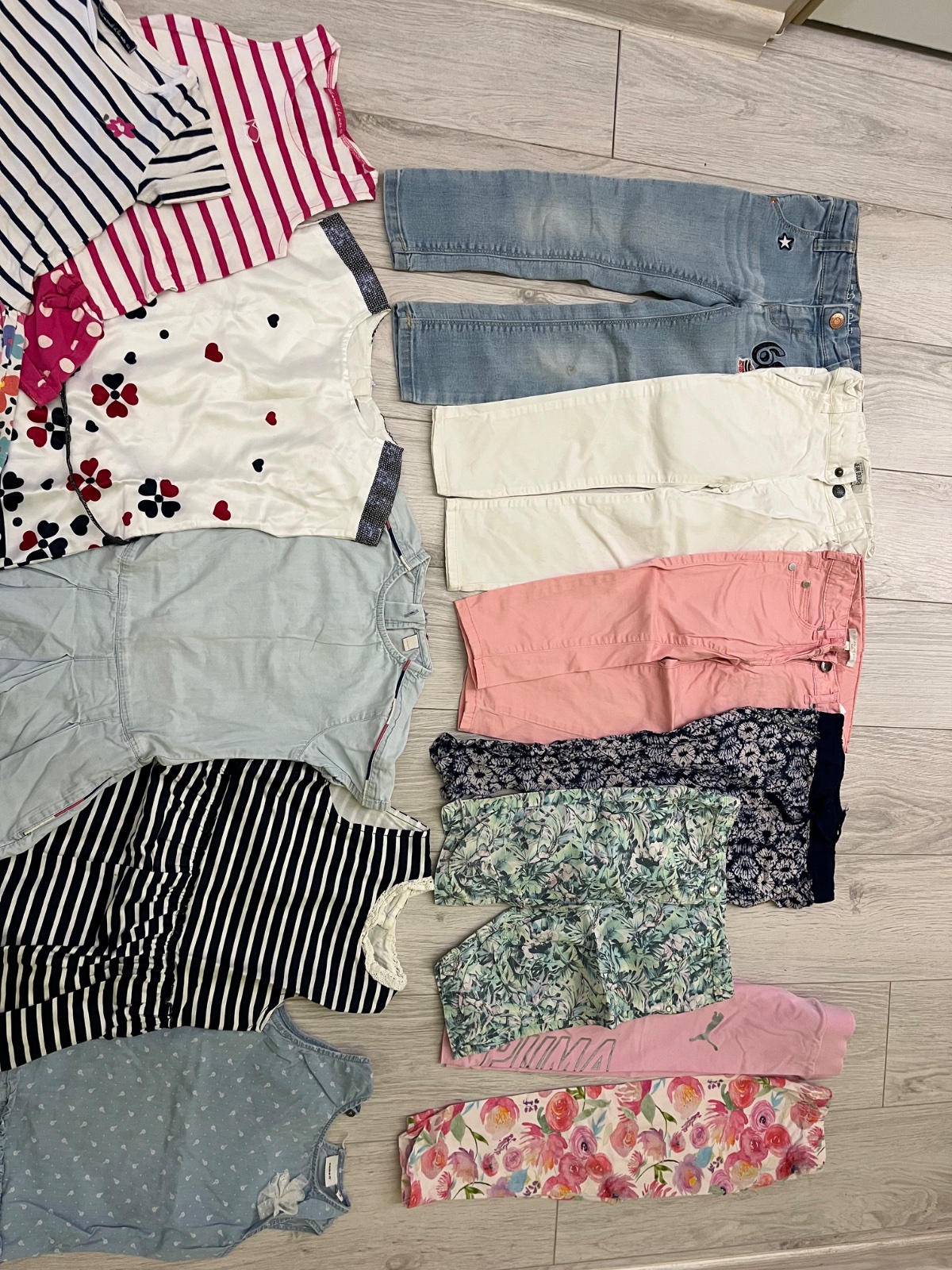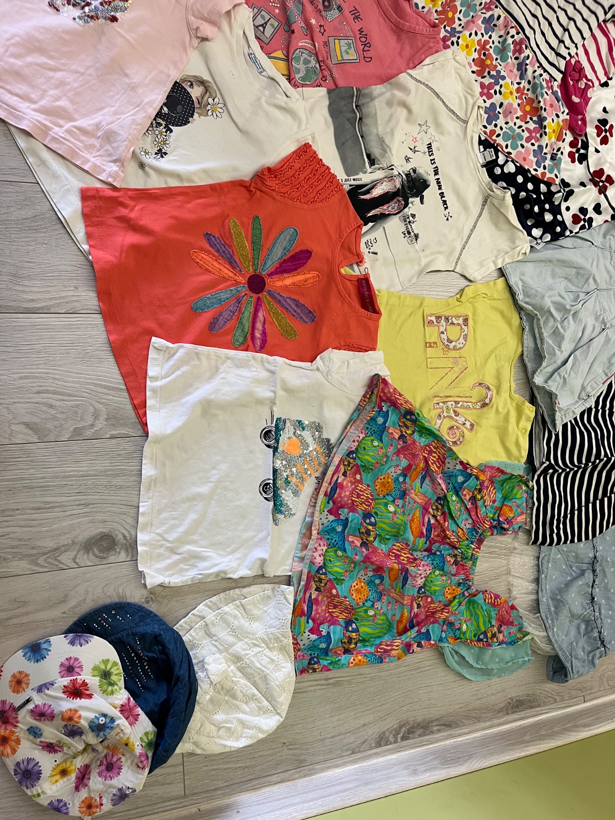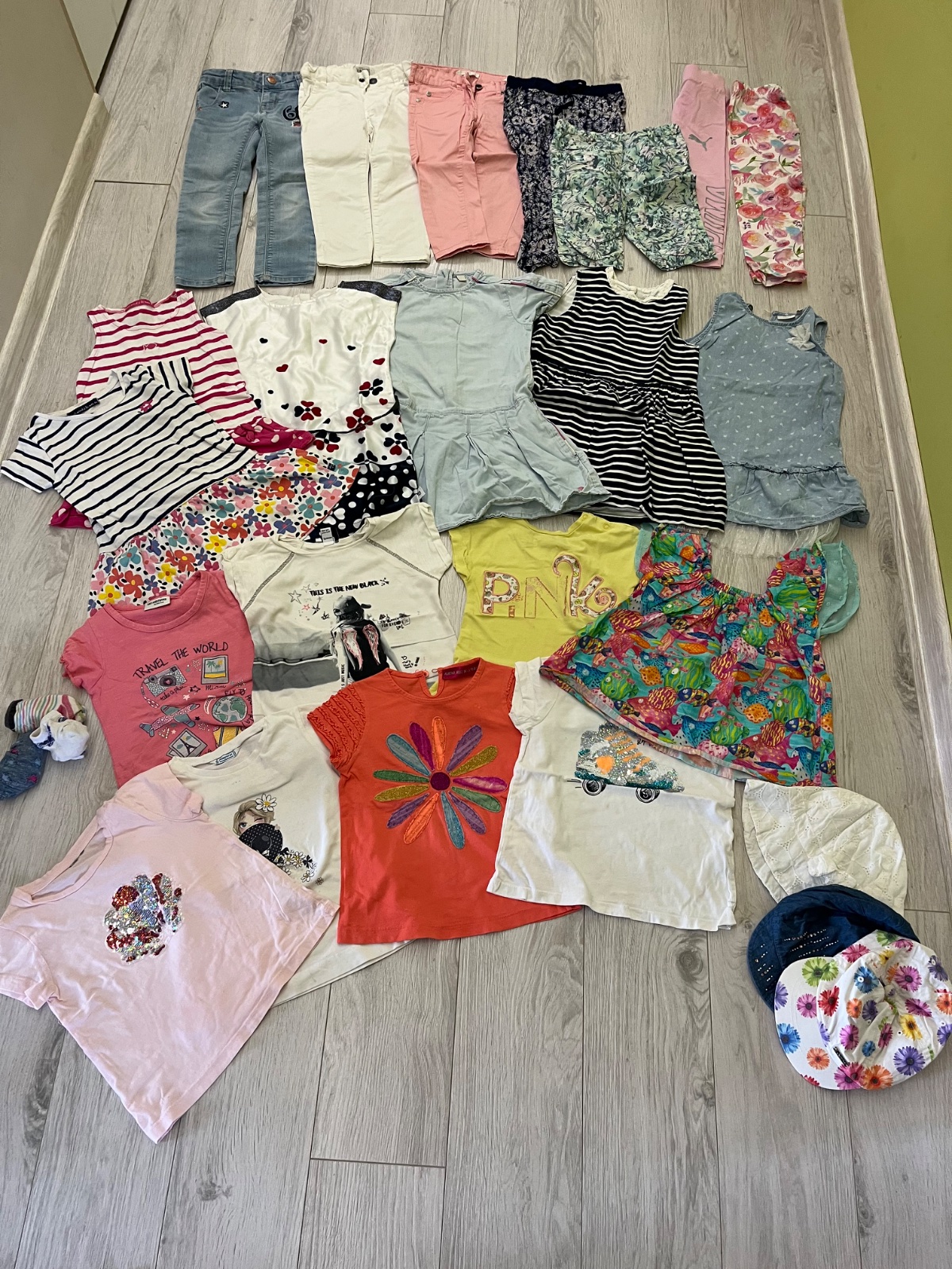 Posuvam tento mix letného oblečenia pre dievča, rôzne značky. Veľkosť 98 až 104. Šaty 6ks, tricko 8ks, nohavice 4ks, legíny 2ks, kraťasy 1ks, klobucik, šiltovky.