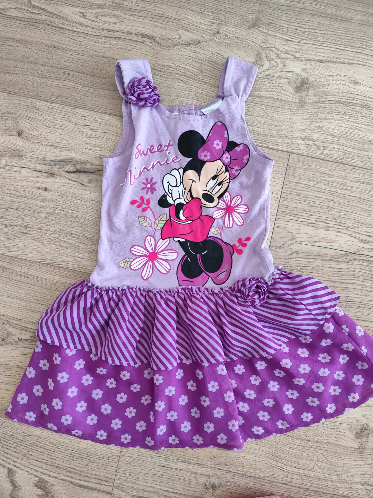 Minnie fialové šaty, nosenie trochu vidieť, spodnicka má chybu- rozprávaný šev, ale jednoducho sa dá opraviť a pri nosení nie je vidieť ani teraz
