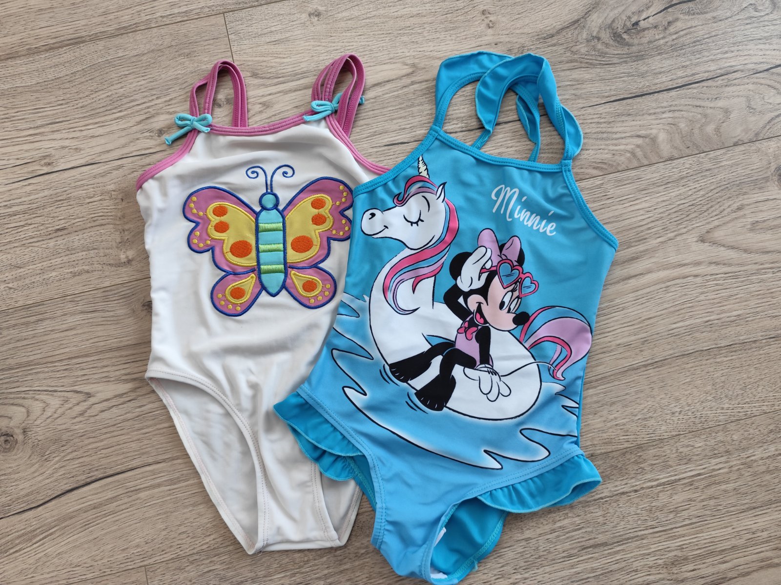 Pridávam 2ks plavky - ružové nosené viac, na Minnie menej pruží tá gumička na ramienkach, ale určite ešte poslúžia minimálne na kúpanie na záhrade.