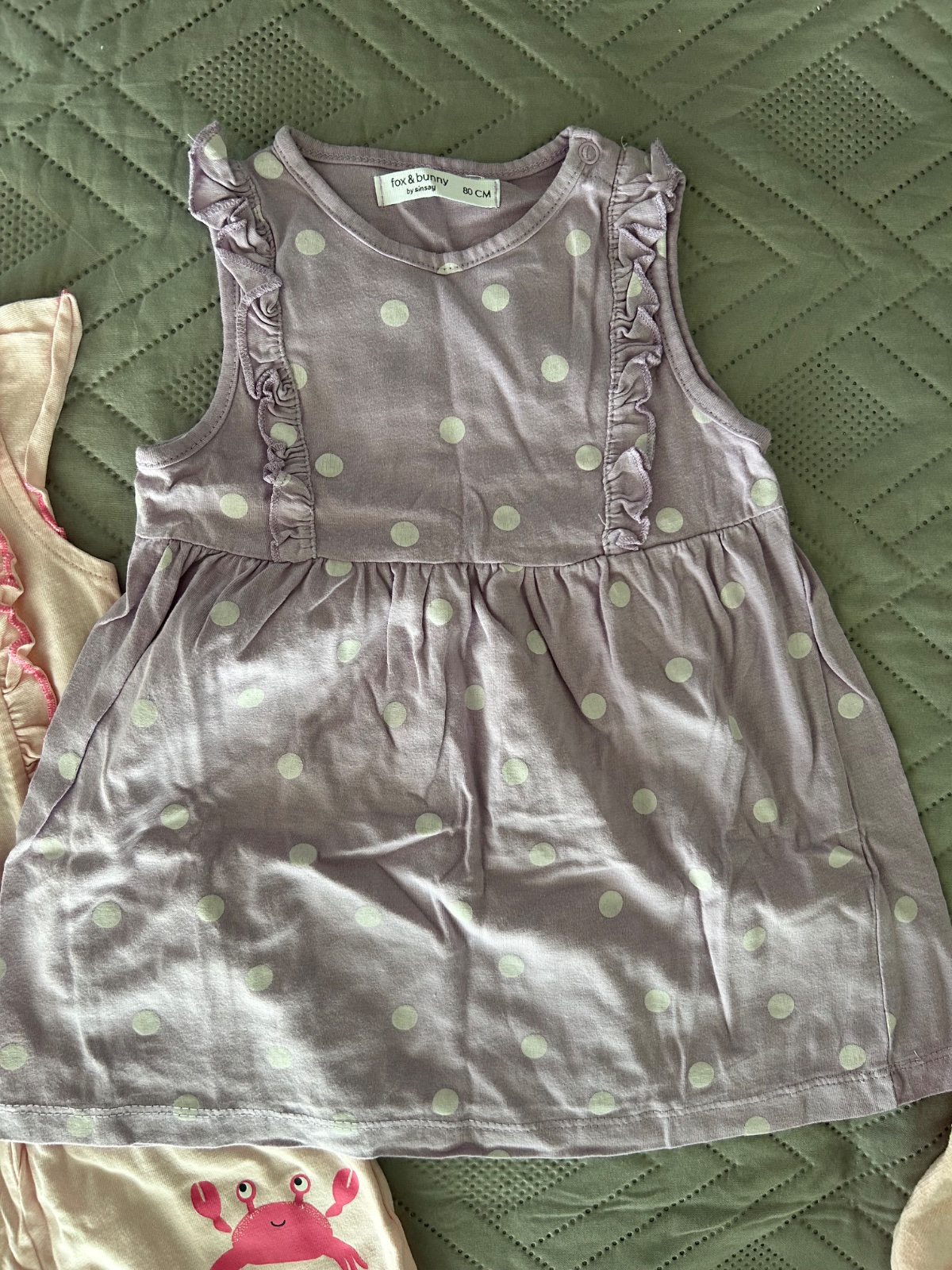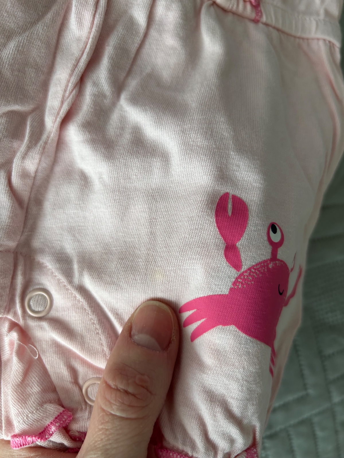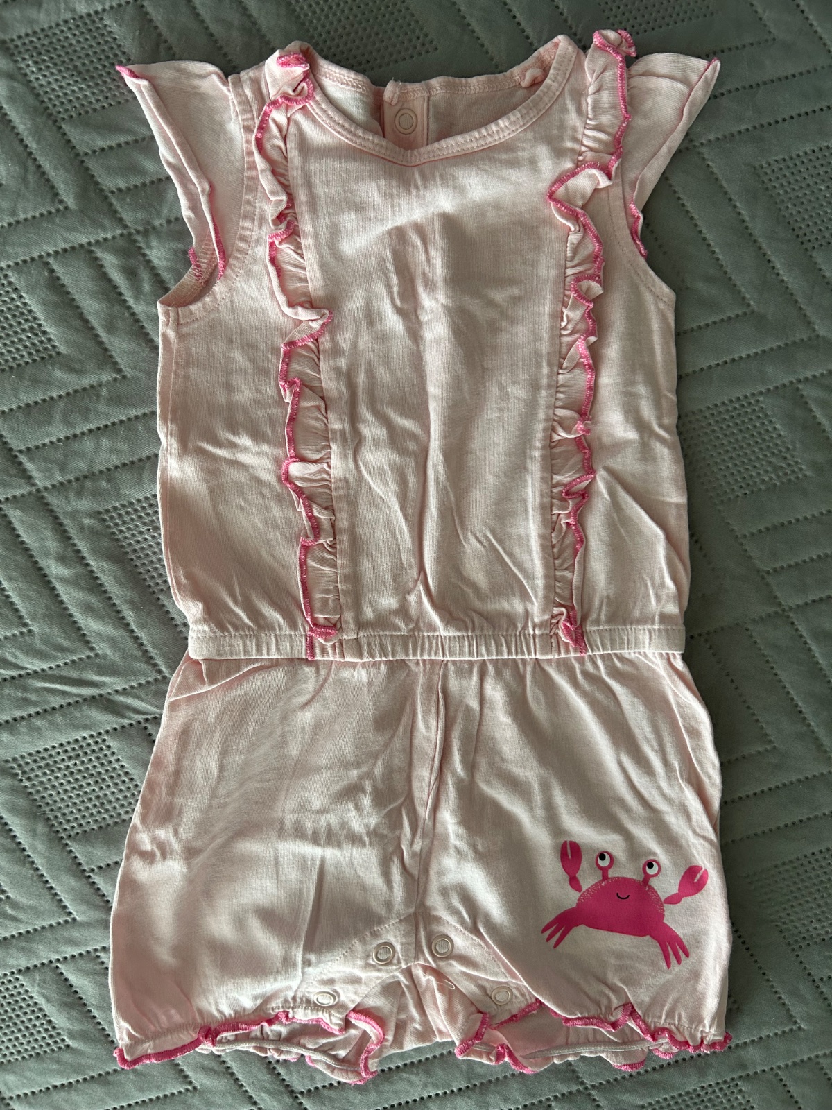 Overal s potlačou kraba - zapínanie vzadu na chrbátiku aj medzi nožkami. Lupillu. Pri krabovi malý bledý fliačik. Veľ.74-80
