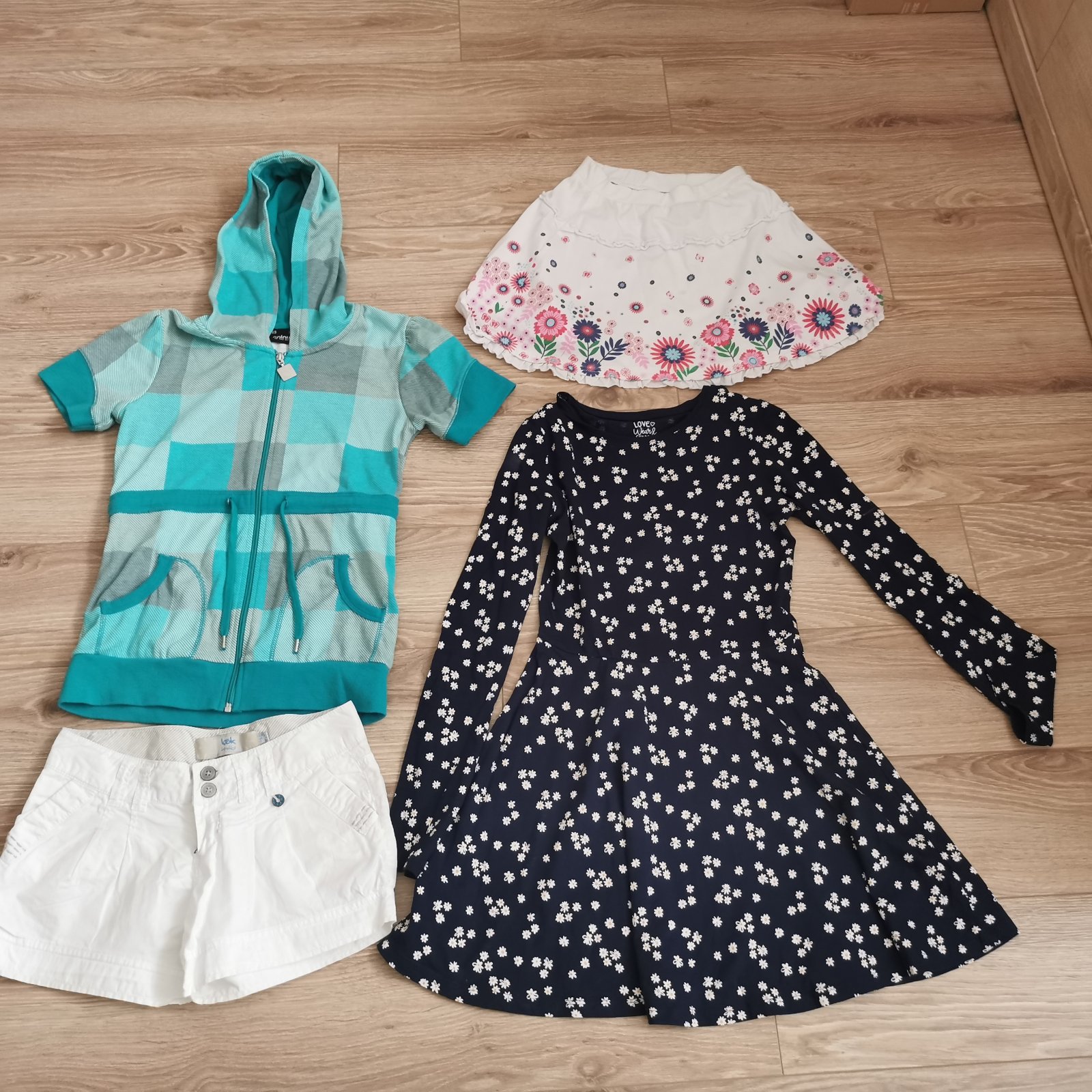 Napravo kratase a mikina xs ale nosili sme 11-12rokov,saty uvedené na 13rokov,no mali sme tiež skôr. Cena spolu 4€ biela sukňa a kratase už niesu