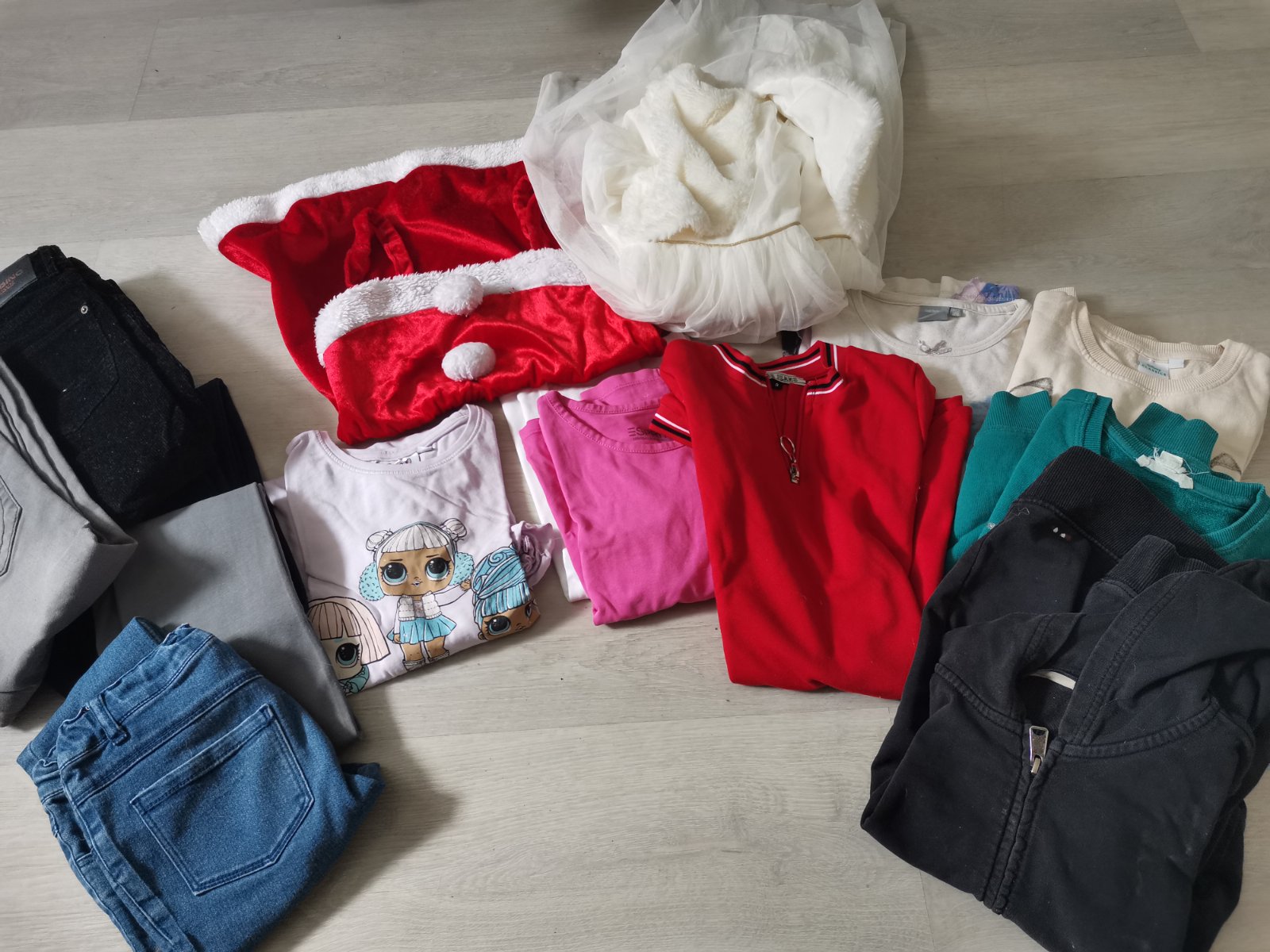 Balíček vecí vo veľmi dobrom stave. Nové rifle Tom Taylor, Krásne šaty od Billieblush 1x oblečené na Vianoce, značky aj Esprit, Napapirji, Vignino...