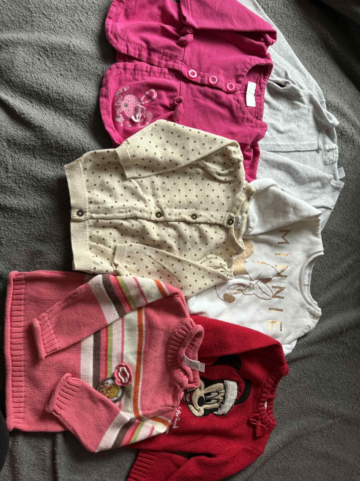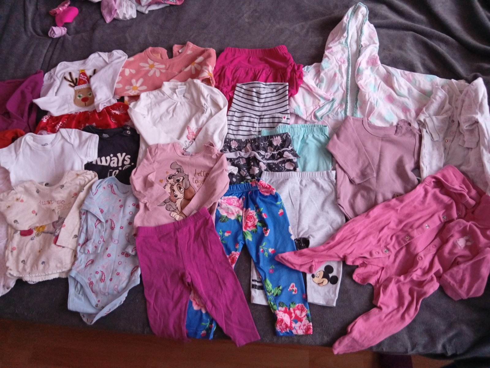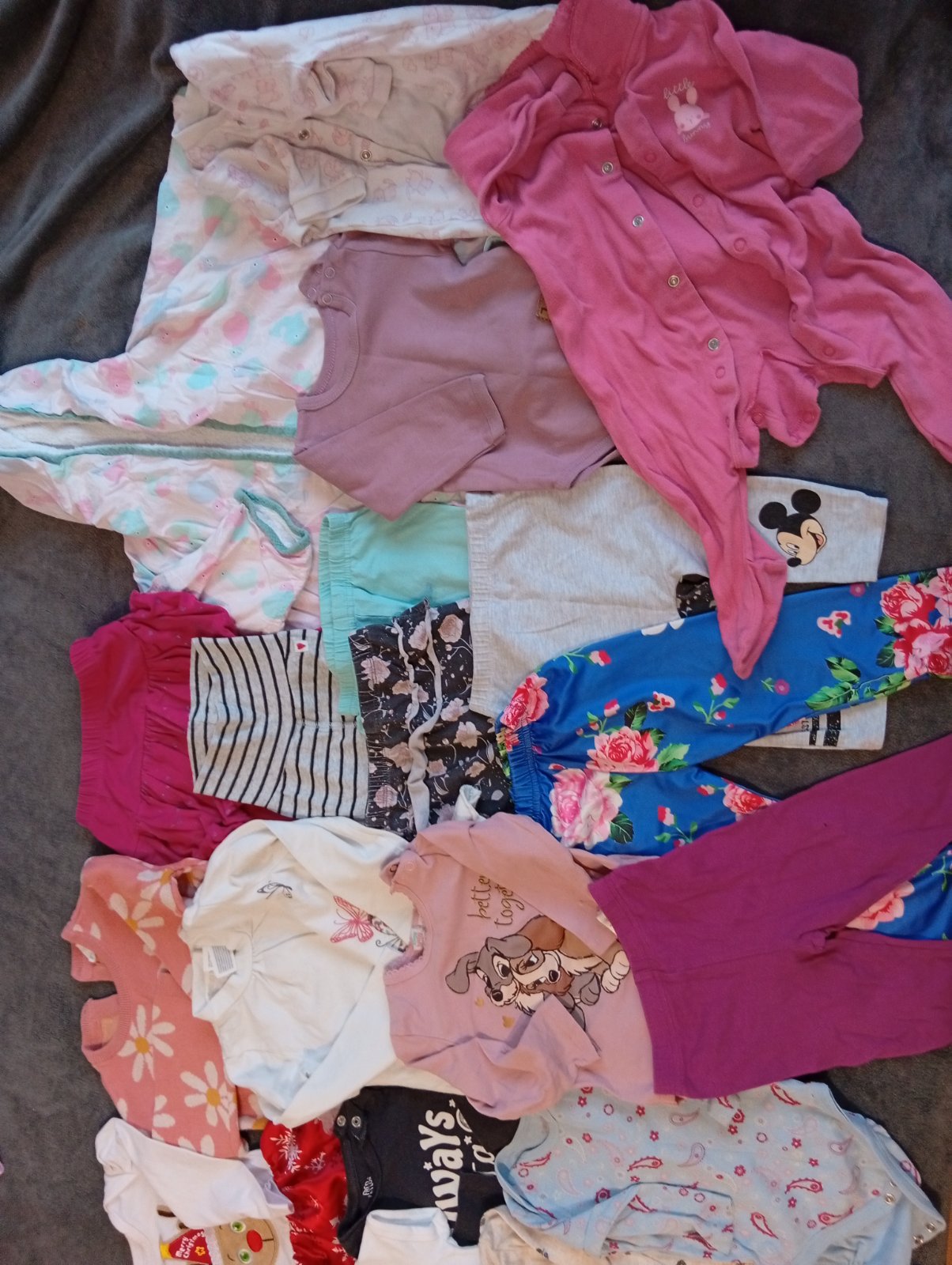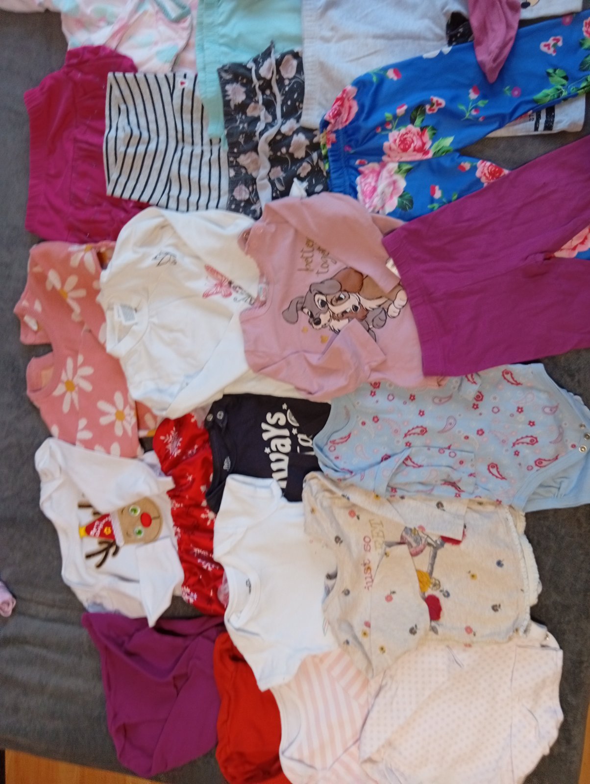 Balík oblečenia na donosenie (mix veľkosti) - 1x pyžamko, 2x nohavice (ružové sú teplejšie), 3 tričká. Naše dievčatá nosili cca od 6 - 12mes. Vecičky sú s fliačikmi, žlté nohavice vyšúchané kolienk...