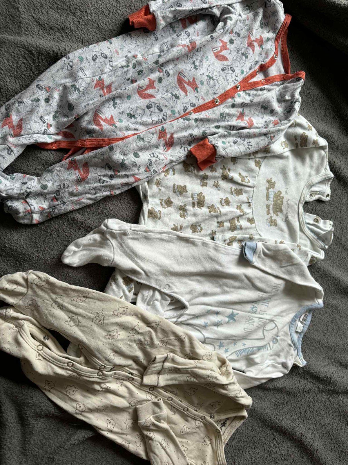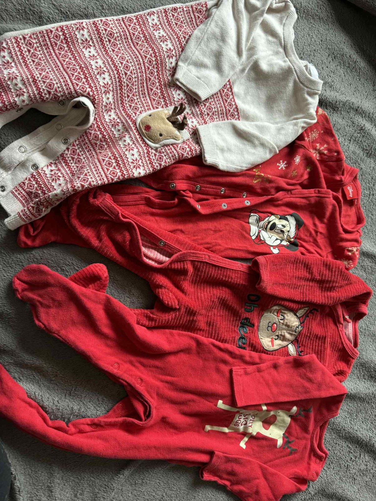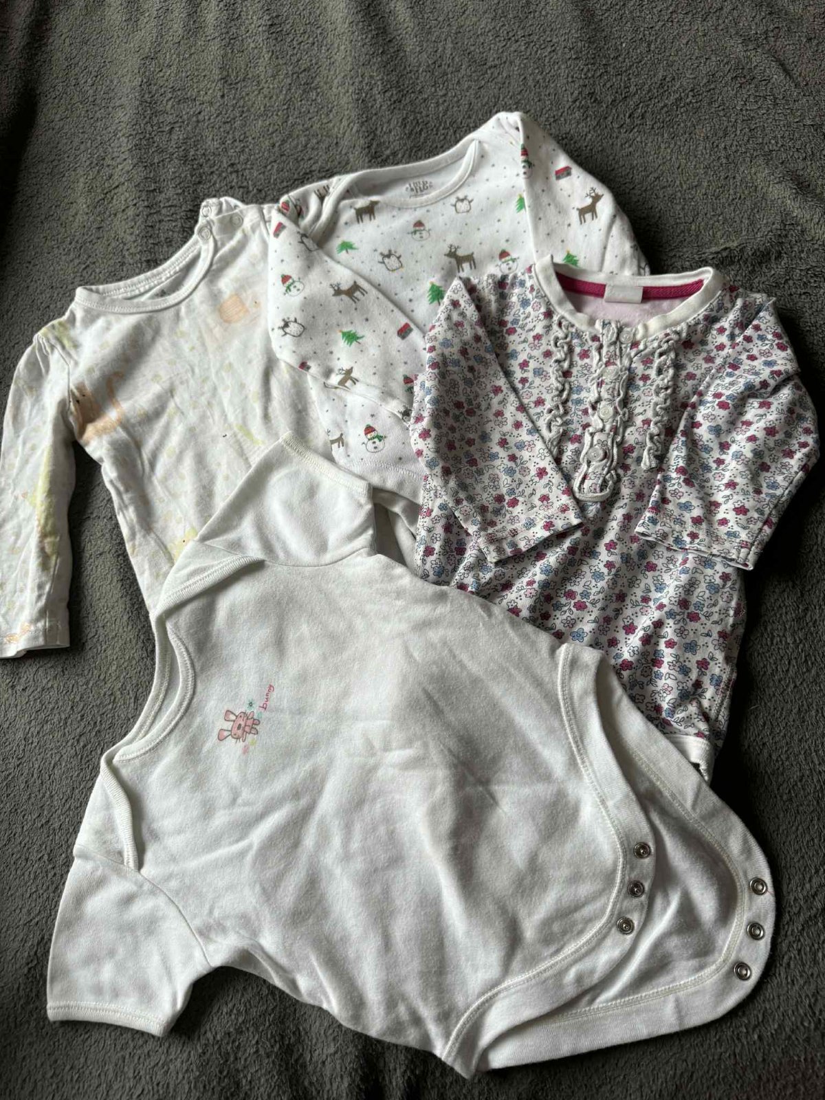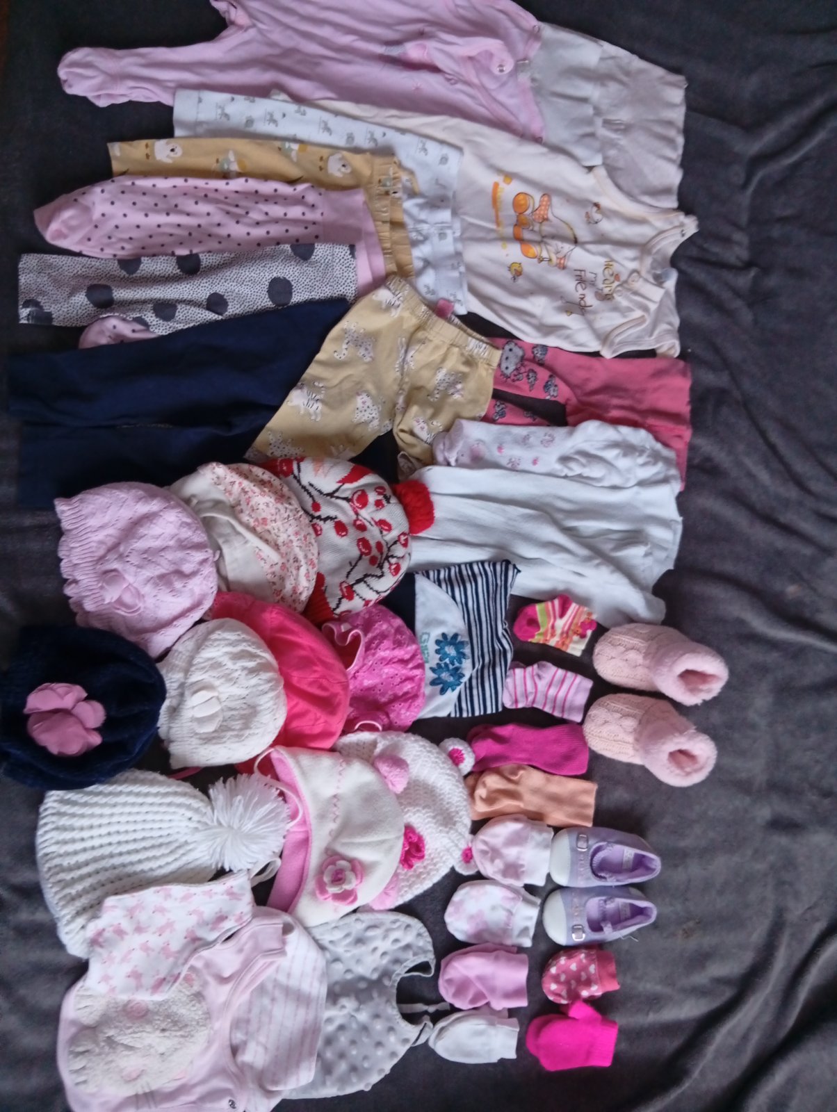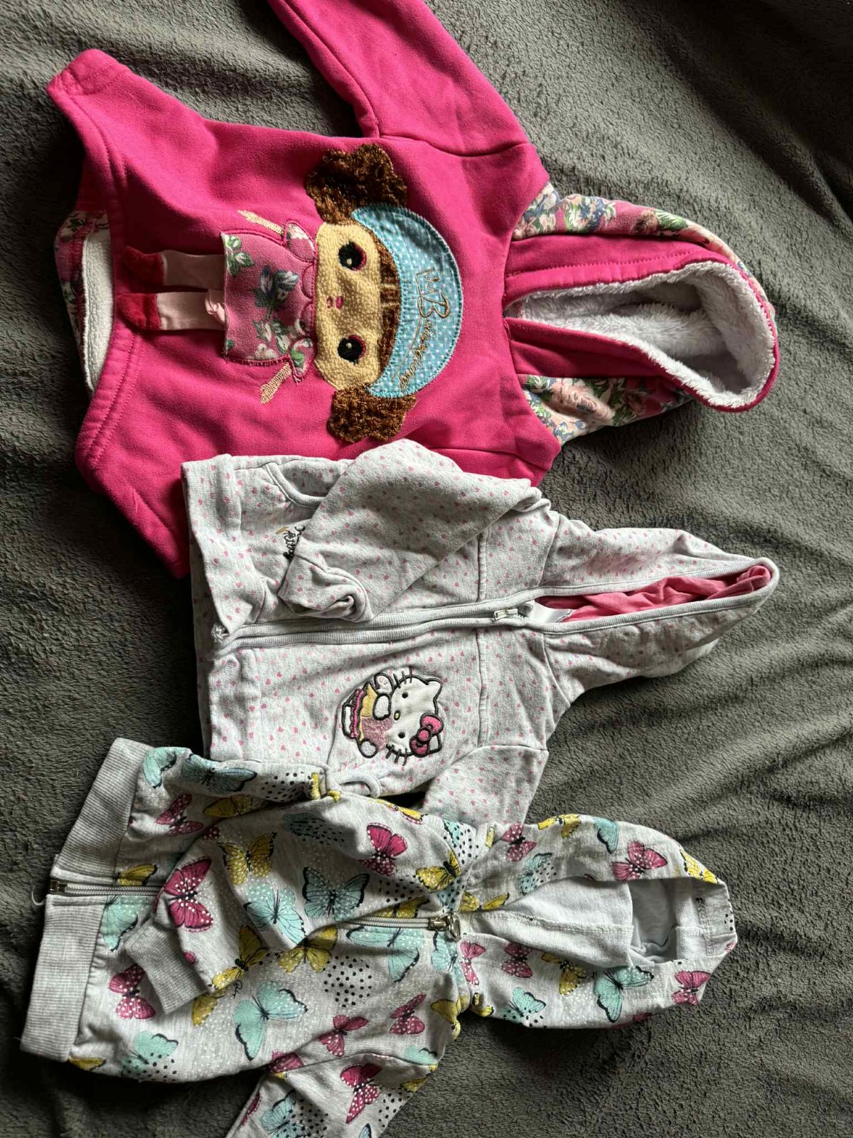 Balík oblečenia na donosenie (mix veľkosti) - 1x pyžamko, 2x nohavice (ružové sú teplejšie), 3 tričká. Naše dievčatá nosili cca od 6 - 12mes. Vecičky sú s fliačikmi, žlté nohavice vyšúchané kolienk...