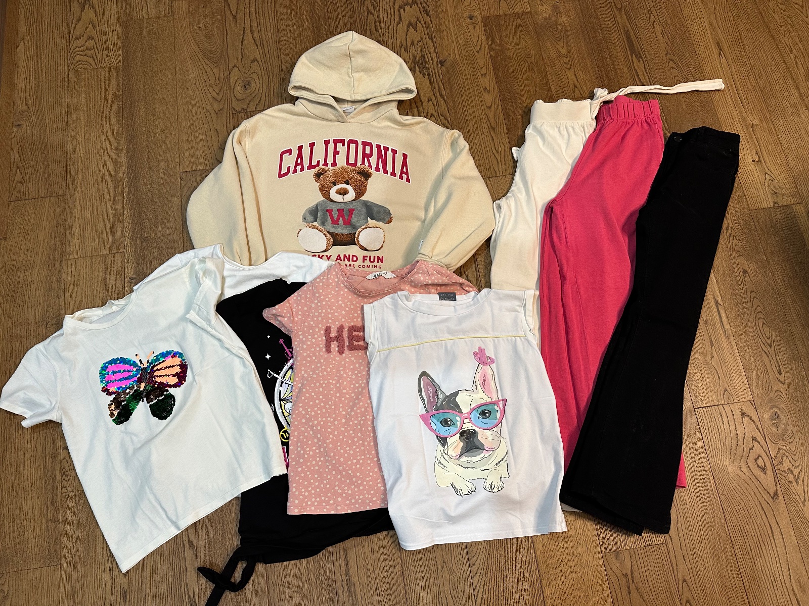 Obsah balíka: rolák, tričko 11ks, predĺžená košieľka, mikina na zips, vetrovka, riflové šaty, rifle 6ks, zateplené nohavice 2ks, tepláky, zateplené legíny, legíny, pančuchy 2 ks, termo prádlo