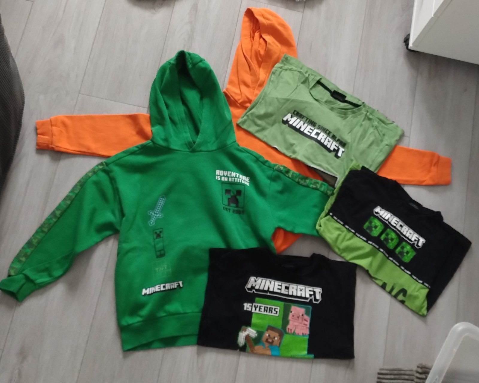 Predám balík oblečenia pre chlapca, veľkosť 134/140, oranžová mikina nosená, veľkosť 134/140, značka H&M, zelená mikina nenosena veľkosť 140, značka F&F, tričká s krátkym rukávom malo nosené, veľkosť 140, značka F&F.