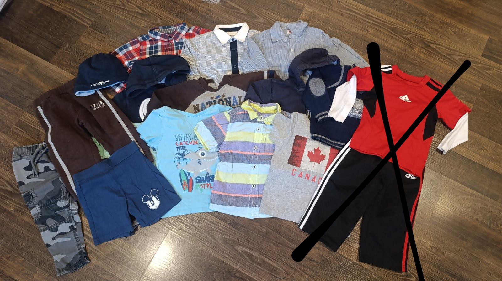 3x košeľa dlhý rukáv, 1x košeľa krátky rukáv, 1x sveter, 3x mikina, 3x tričko krátky rukáv, 1x kraťase, 1x tepláky, 1x maskače, 1x čapica. 15kusov oblečenia, super stav. Bez Adidas súpravy, cena upravena