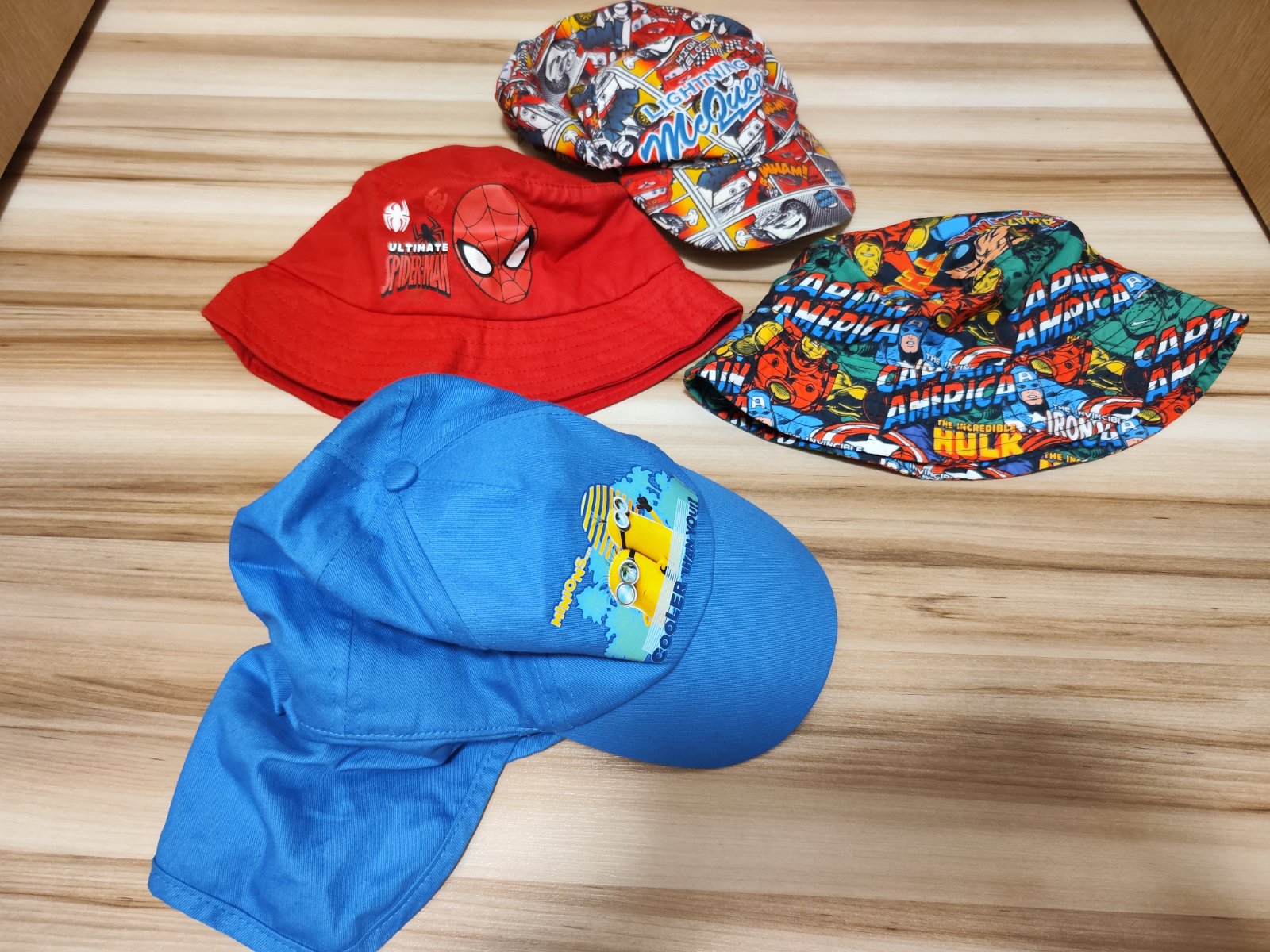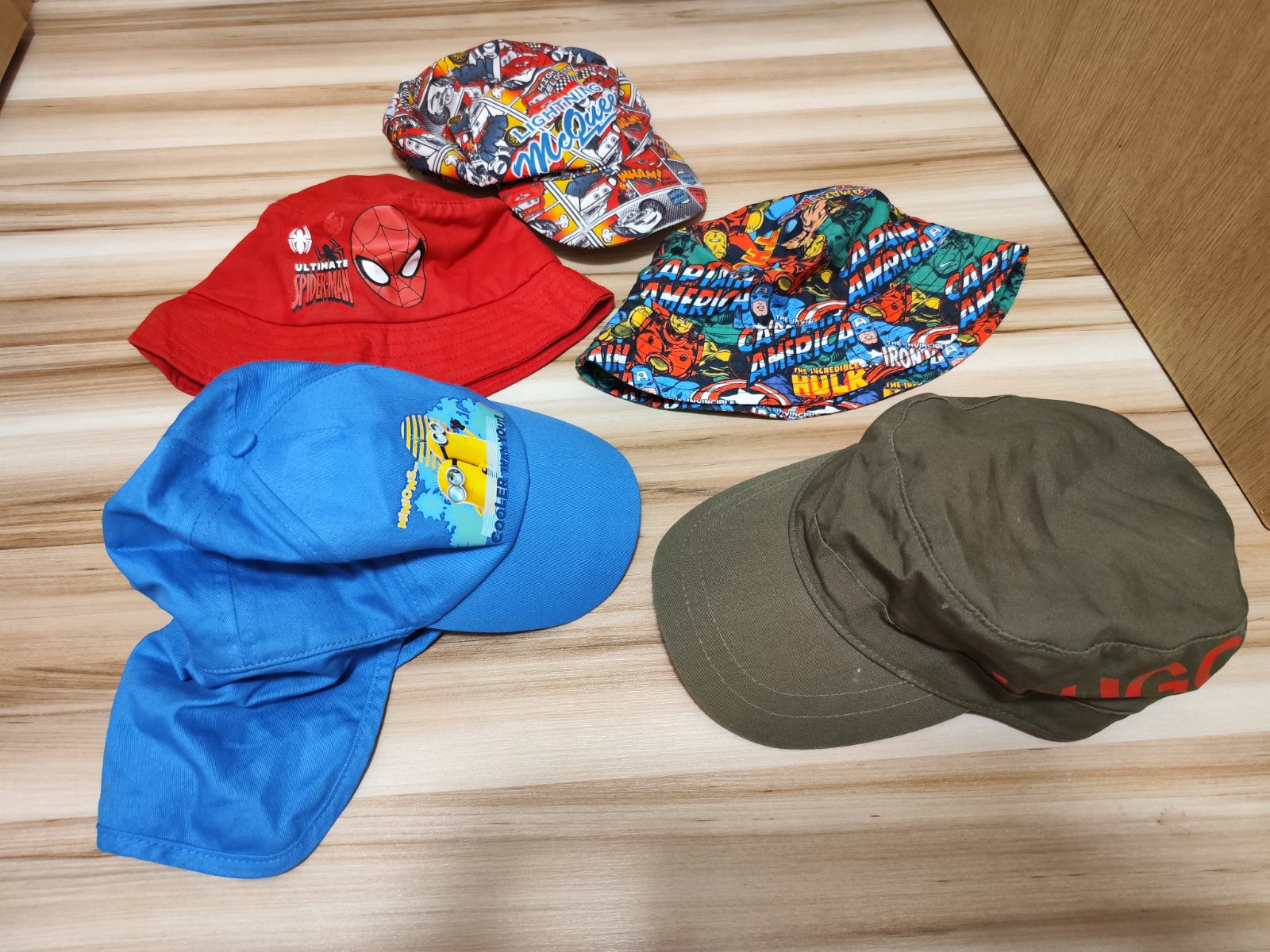 Predam spolu trocha nosene klobuciky a siltovky. Velkosti 54, ta Mimoni siltovka s ochranou sije je 50/52, Hugo siltovka je dospelacka. Vsetko spolu len 3€.