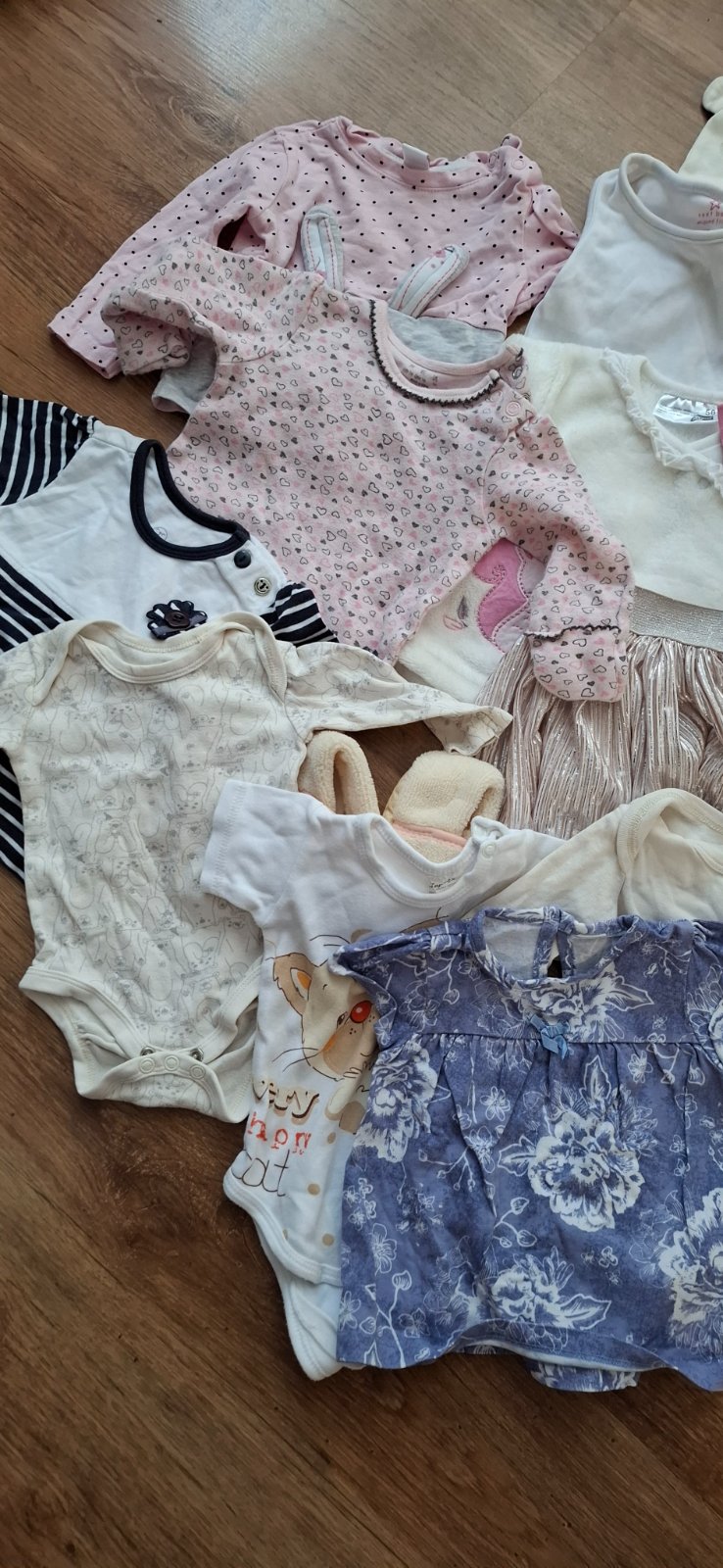Balíček oblečenia označené v. 62, ale je to skôr 56. Obsahuje dupačky objednané z eshopu - vynikajúci stav; body s dlhým rukávom zn. Disney - vyblednuté farby a žmolky, inak bez závad. Pribaľujem k...