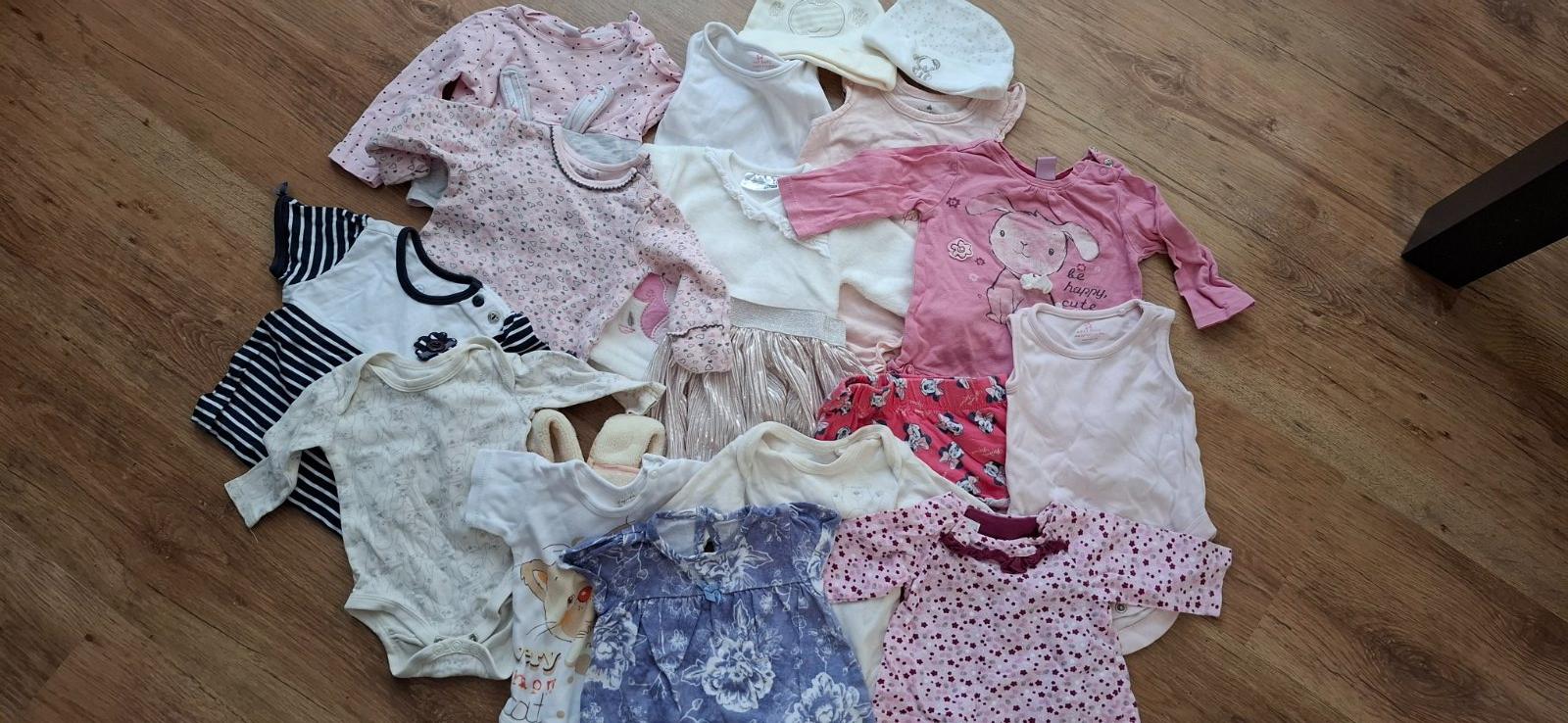 Mix oblečenia na 3-6 mesiacov - väčšina je 68, ale niektoré vecičky sú 62. Všetky sú nosený stav bez fľakov a bez dier, nosenie vidno na žmolkoch z prania a na žltých body popraskaná potlač - viď f...