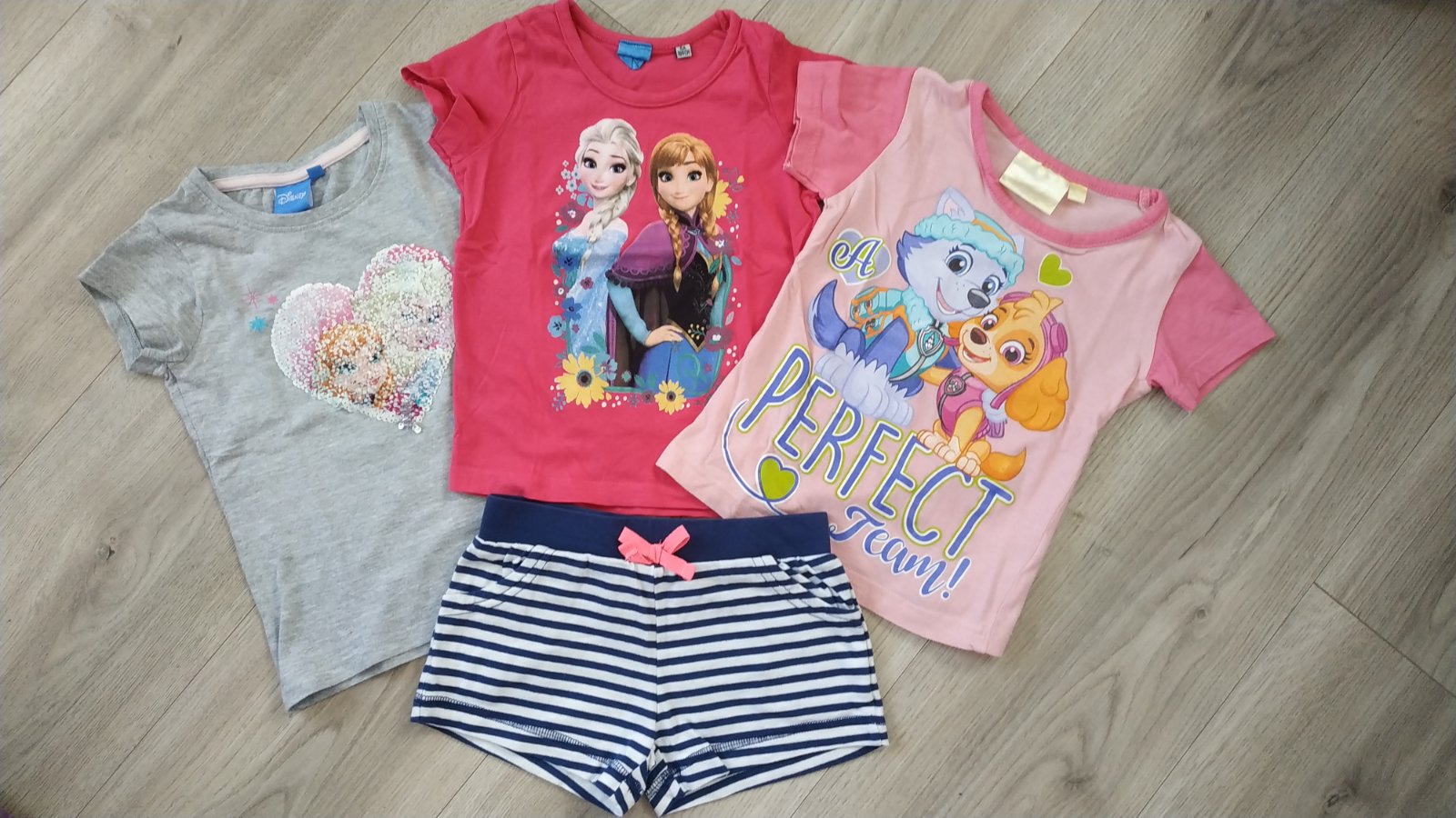 Dievčenské tričká s krátkym rukávom vo veľkosti 104 + kraťasy 98/104. Používané, ale stále pekné, bez fľakov a dier. Cena za balíček 4 € + pošta alebo osobný odber.