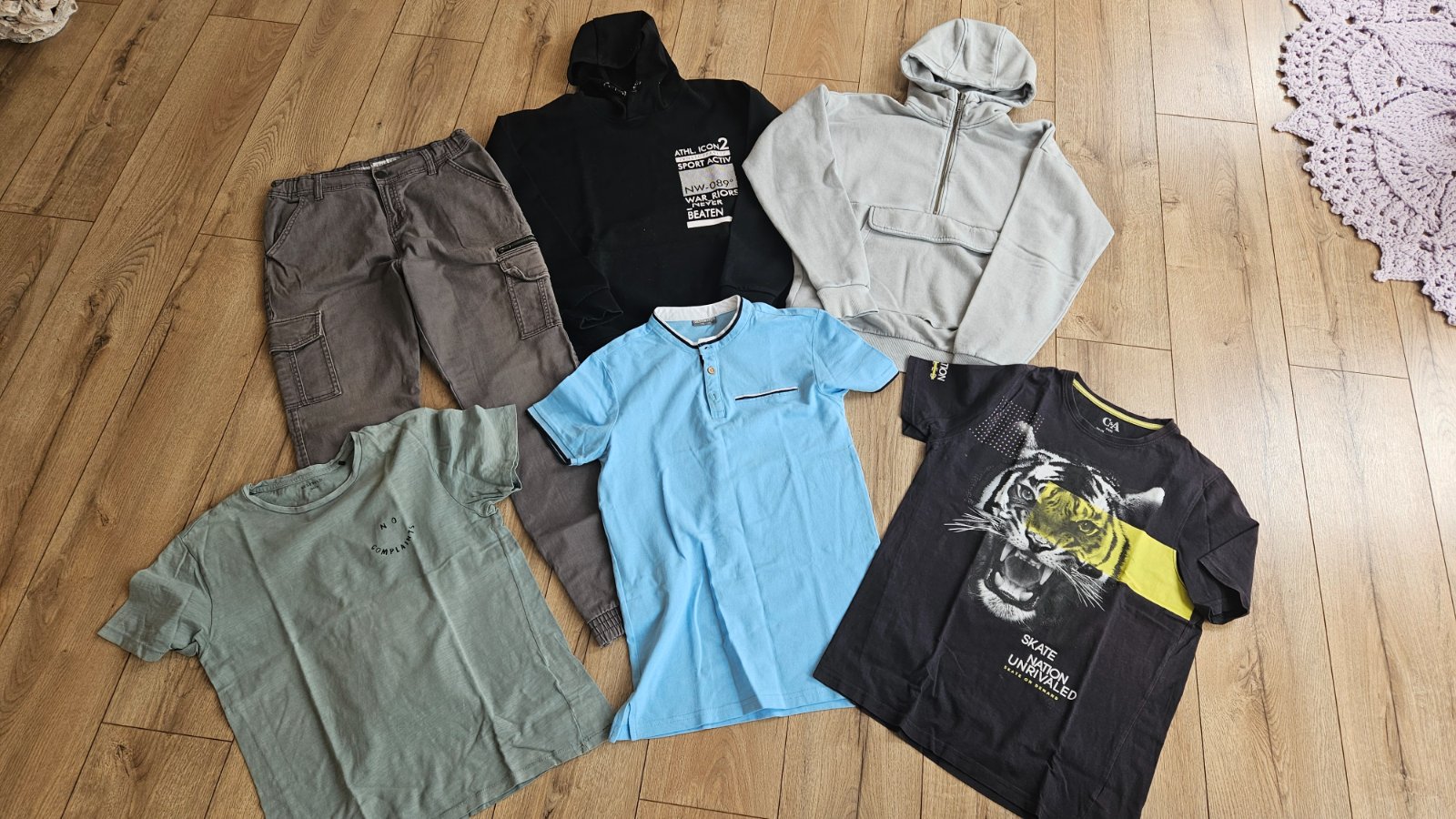 1x parádne, frajerské cargo nohavice, 2x mikina - pekné detaily aj na chrbte, 1x polokošela a 2x tričká s krát.rukávom