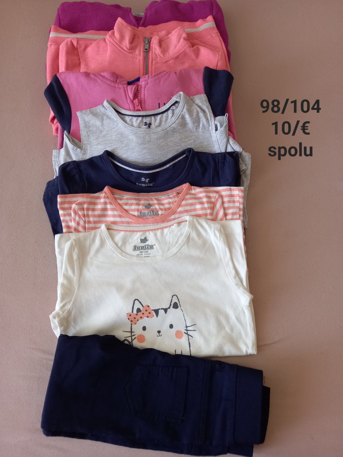 Predám balík pre dievčatko V dobrom stave v 98/104. Tričko dlhý rukáv 4x. Mikina 3x, nohavice 1x. Na otázky rada odpoviem. Posielam po prevode na účet.