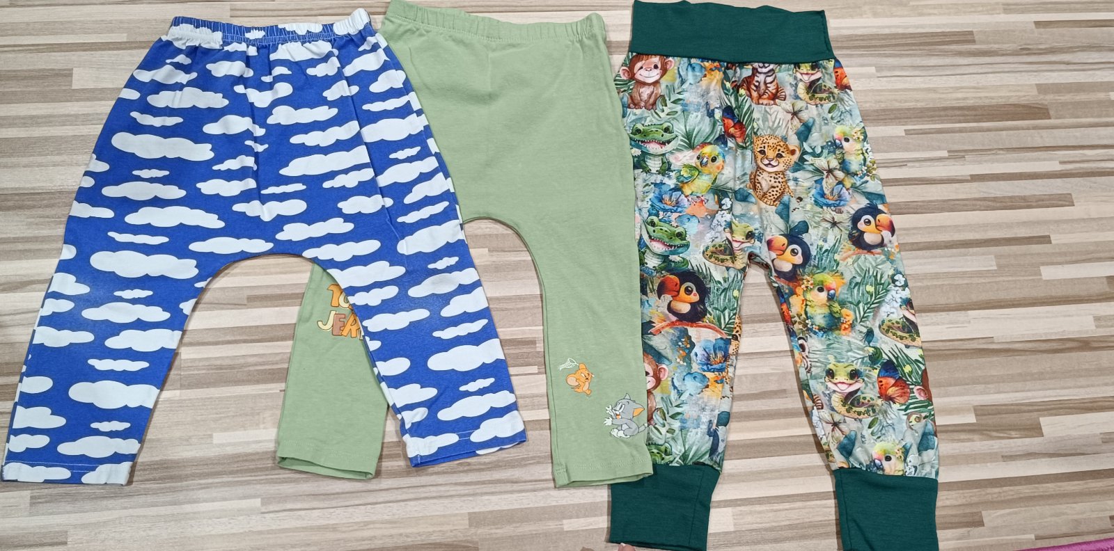 Tepláčiky veľkosť 92 a 98, 1. foto tenšie, 2. foto hrubšie. Obláčikové majú trošku vyblednuté kolienka, oboje červené grátis.