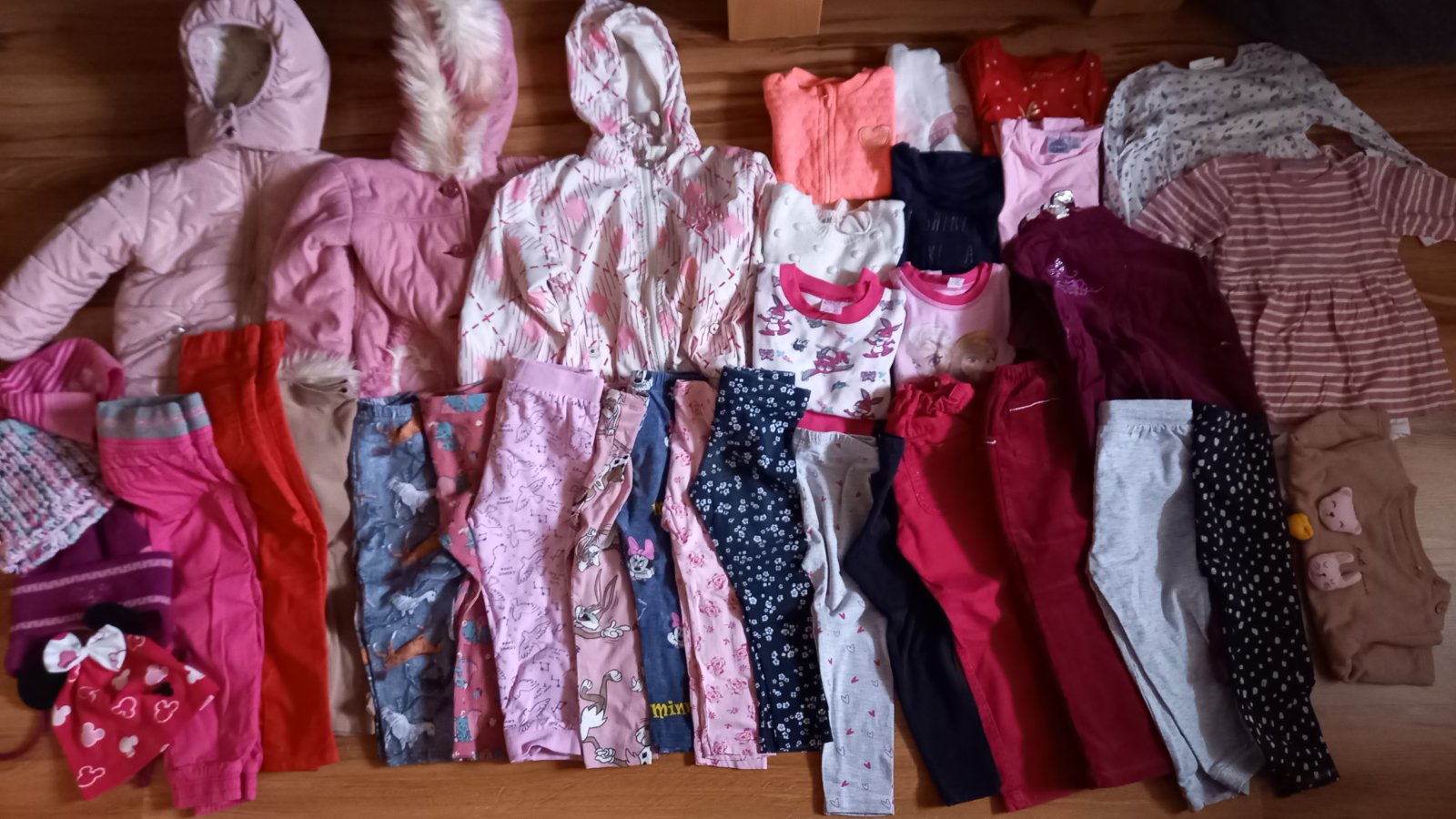 balik veci pre dievcatko - 98-104 cm (2-4 roky). dobry noseny stav, ruzove tricko je flakate (oprane s cervenymi vecami..), na bielom flaky. cena spolu za vsetko co je na foto.