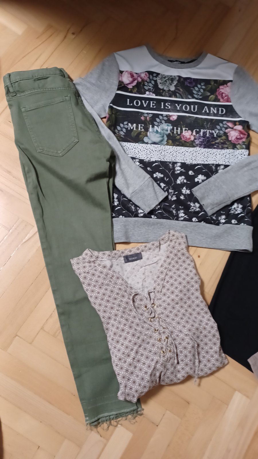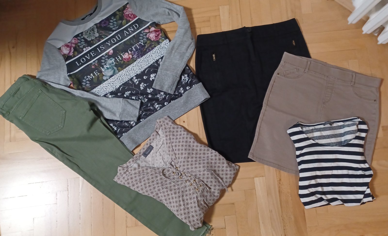 Posuniem balík oblečenia za poštovné. Rifle, blúzka 3/4 rukáv, tričko s dl.rukávom, 2x sukňa, tričko bez rukávov.