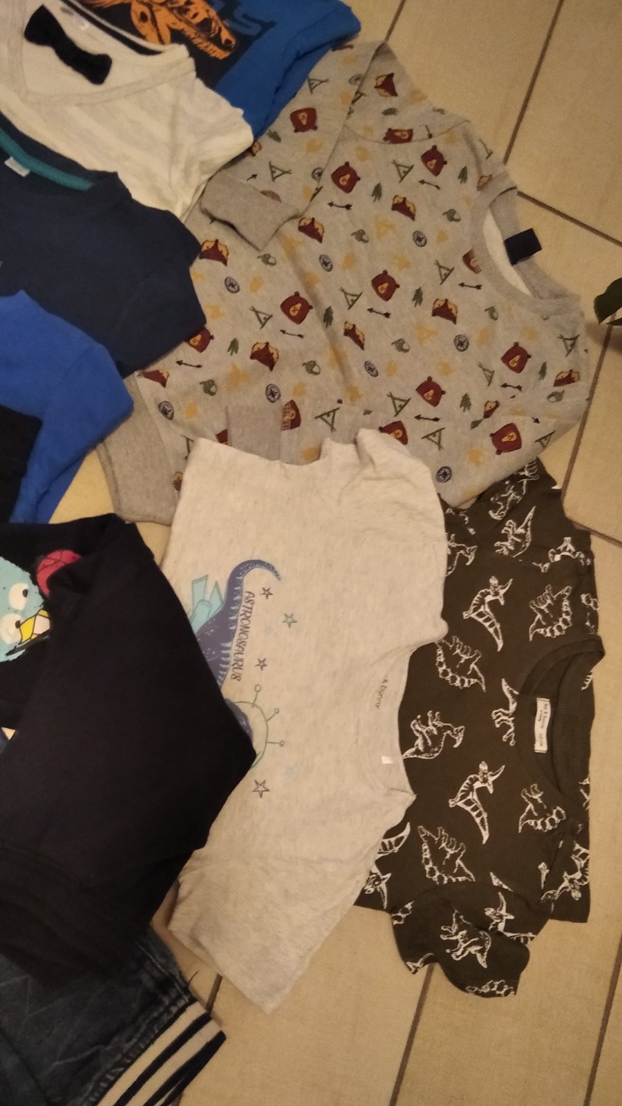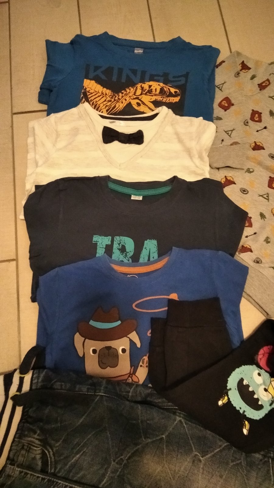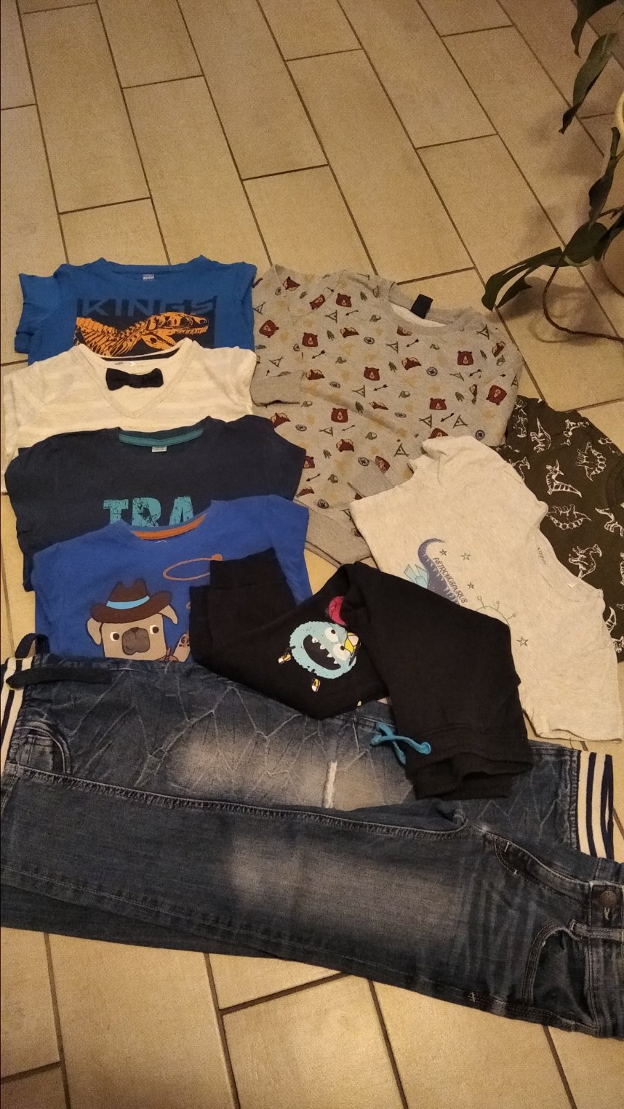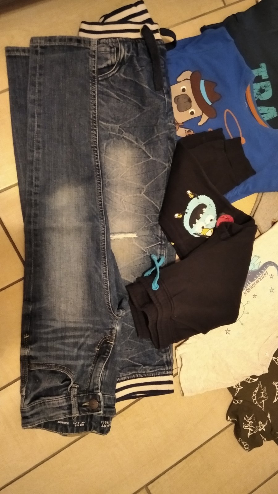2 x rifle (jedny roztrhaný vzhľad na kolene), 4 x tričko dlhý.rukav, bez zmolkov, 2 x tričko krát.rukav, mikina, tepláky všetko bez zmolkov, vhodné do školy