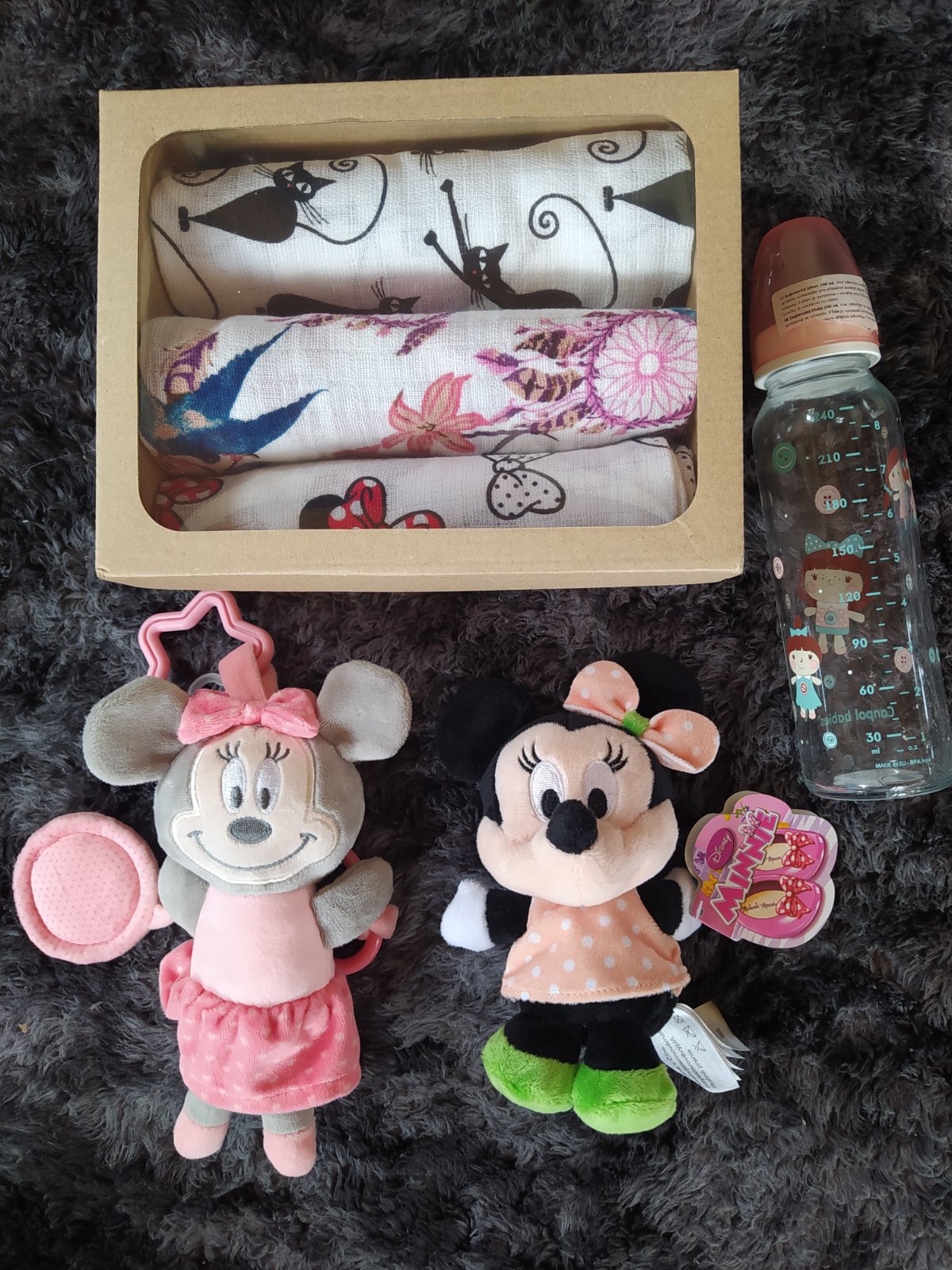 3x plienka,1 plyšová minie,1 závesná hračka na kočík,flasa