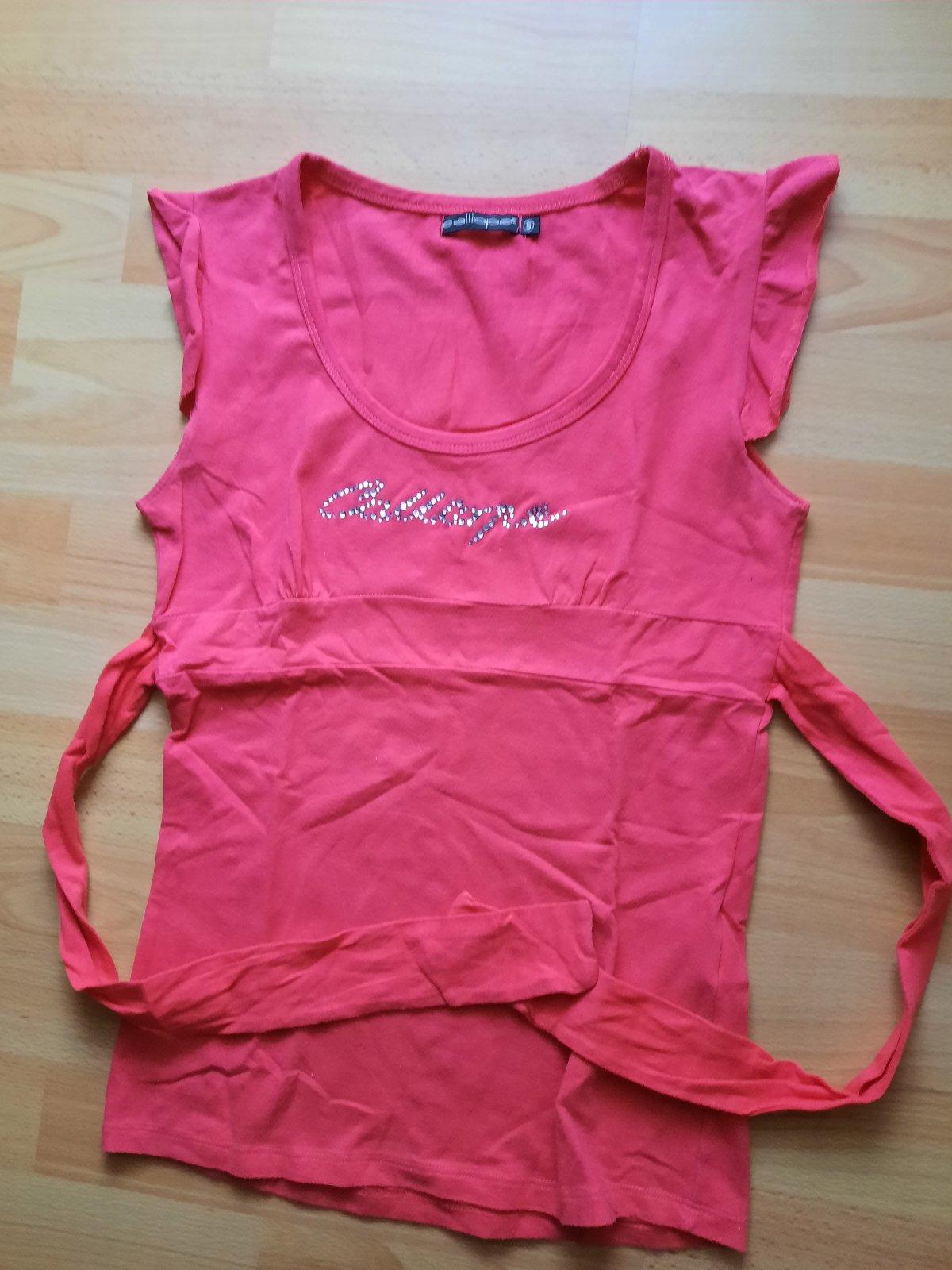 1x bledočervené tričko s kamienkami V-S, zn.Calliope, vzadu sa dajú zaviazať