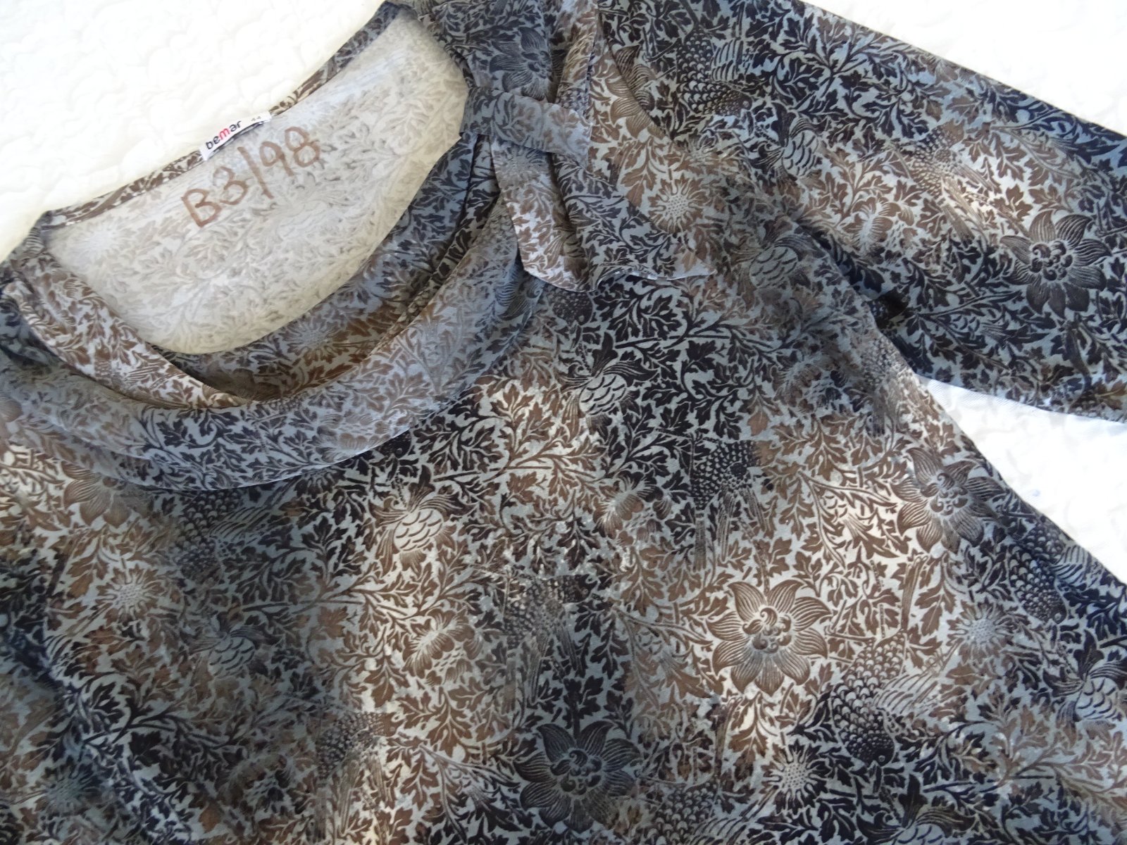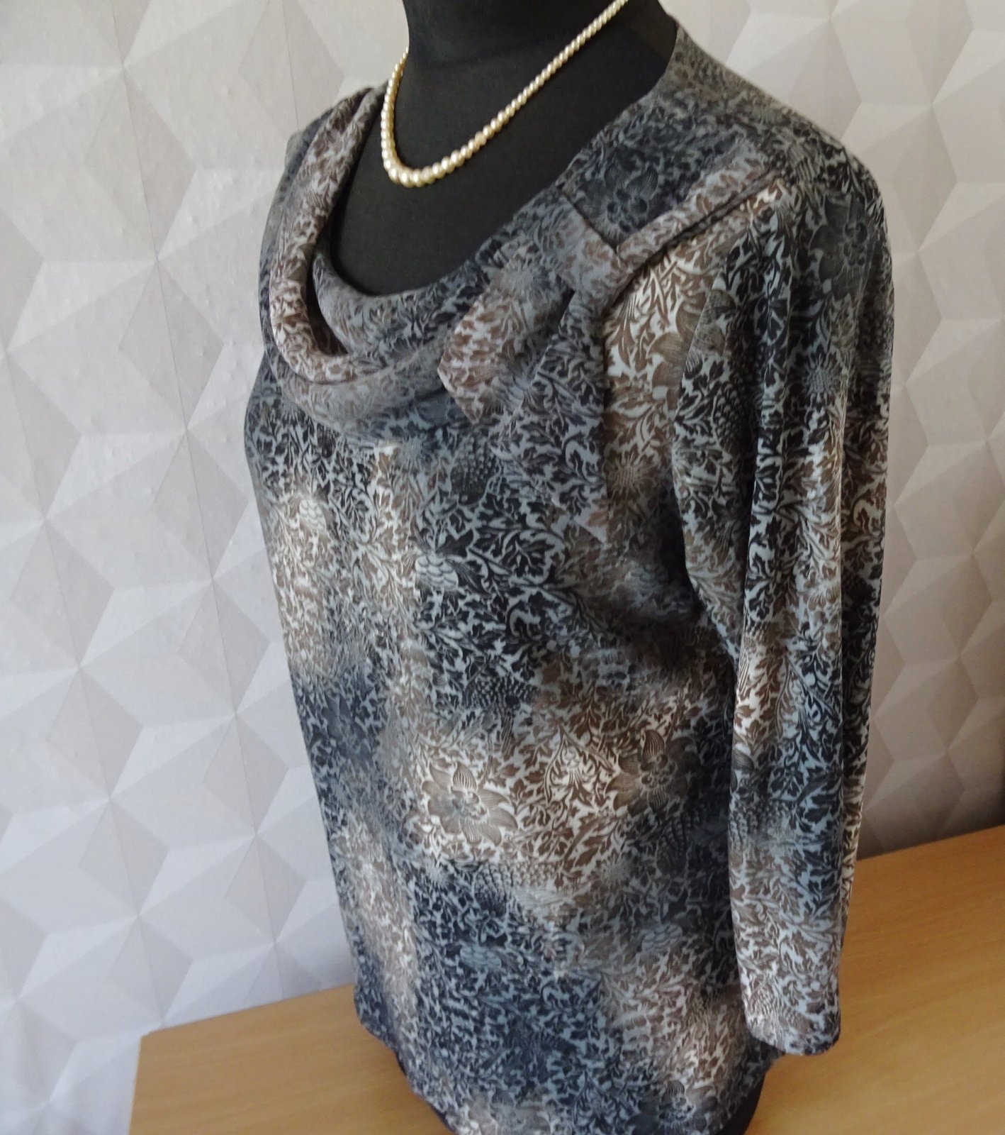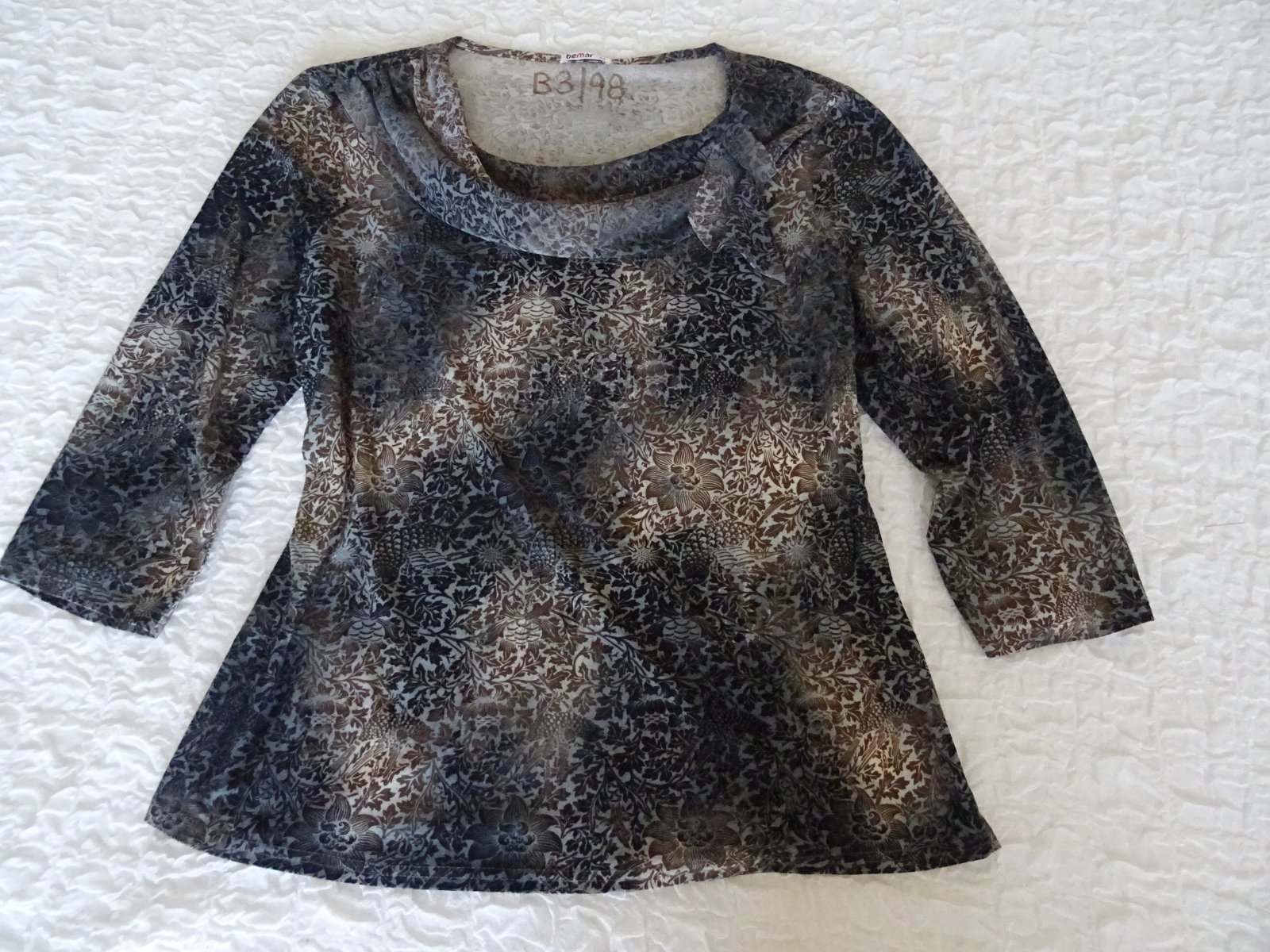 Elastický top Bemar, modrý s krémovým vzorom, dĺžka 59cm, pod pazuchami 2x52cm, rukáv je 3/4 dlžky 45/30cm.