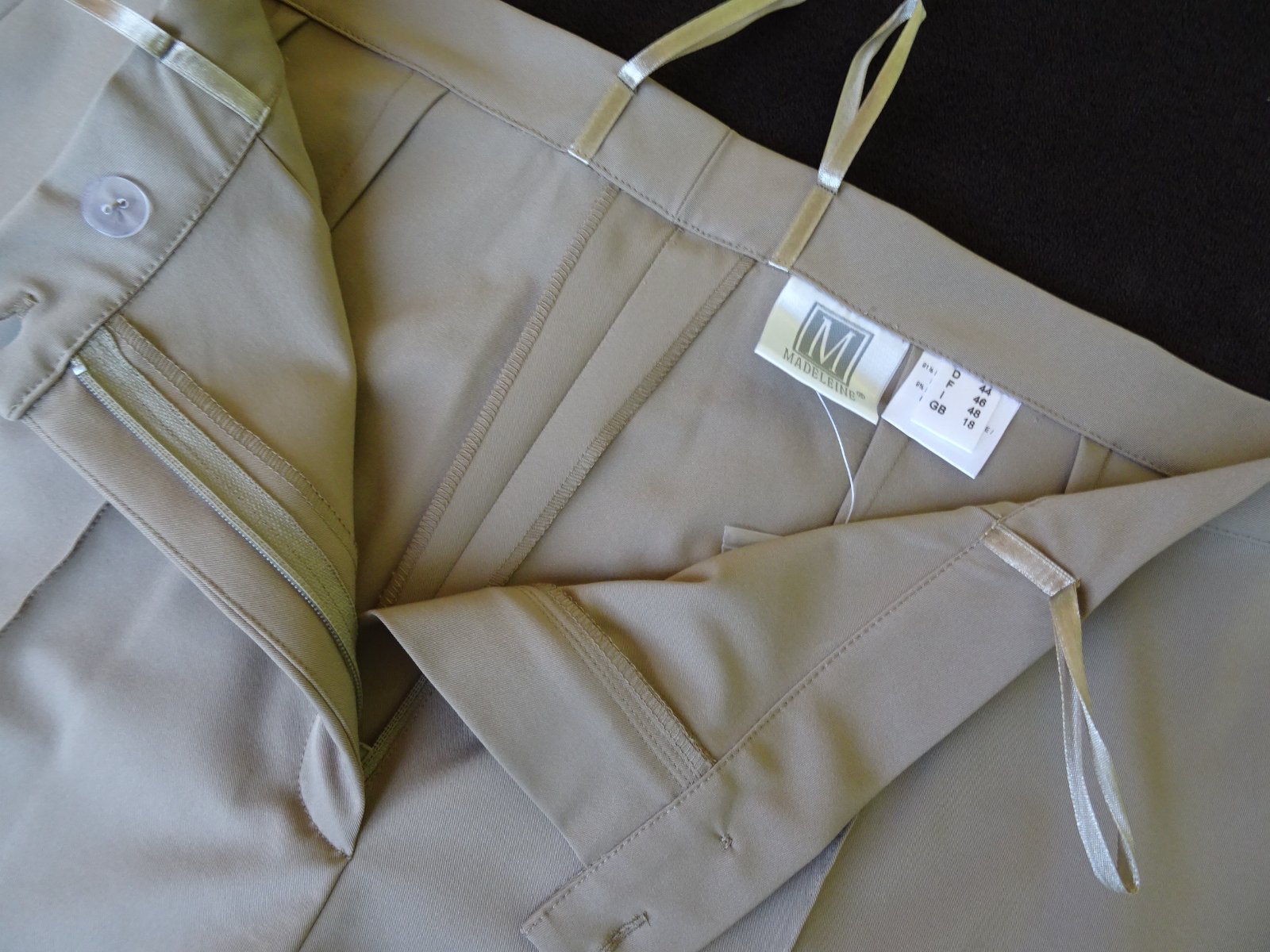 Značkové nohavice Madeleine, veľ. 44 / XL, rozmery: bočná dĺžka 103cm, od rozkroku 75cm, pás 2x41-45cm.
