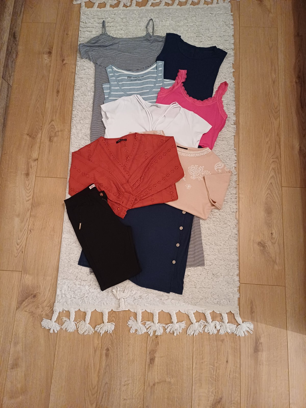 Balík obsahuje 2x dlhé šaty, 2x tielko, 2x tričko krátky rukáv (nenosené), 1x nohavice a dierkovaná blúzka (nová).
