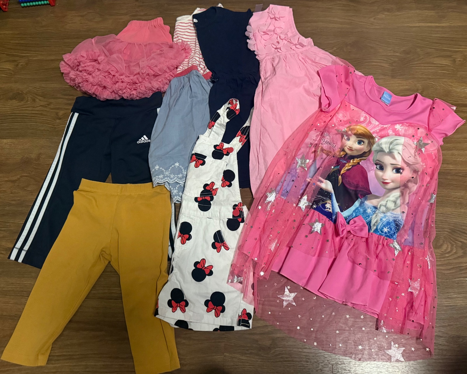 1x ruzova sukna, 2x 3/4 kratase (dlhsie kratase- adidas a lta) saty s riflovou suknou, modry overal minnie kratase (tu mozno sem tam fliacik ale nic strasne su normalne nositelne) ruzove saty (tie sme mali na narodeniny) a frozen myslim len odskusane nikdy nosene bol to darcek z dovolenky v thaisku cena spolu