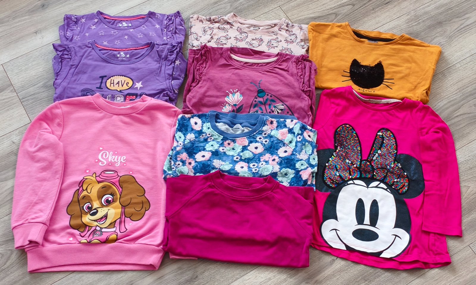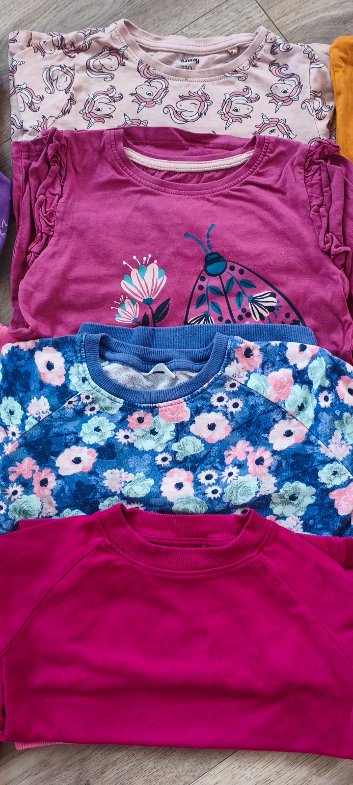 Predám balíček oblečenia pre dievča vo veľkosti 110/116. Niektoré kusy boli oblečené len pár krát, ale aj zvyšok je stále v krásnom stave, bez poškodení, bez fľakov, bez dier. Na legínach sa nájdu jemné žmolky. V balíčku je 9 ks tričiek/mikín s dlhým rukávom a 2 ks legín. Cena za balíček 13 € plus pošta alebo osobný odber. (Predaj po dohode možný aj jednotlivo.)