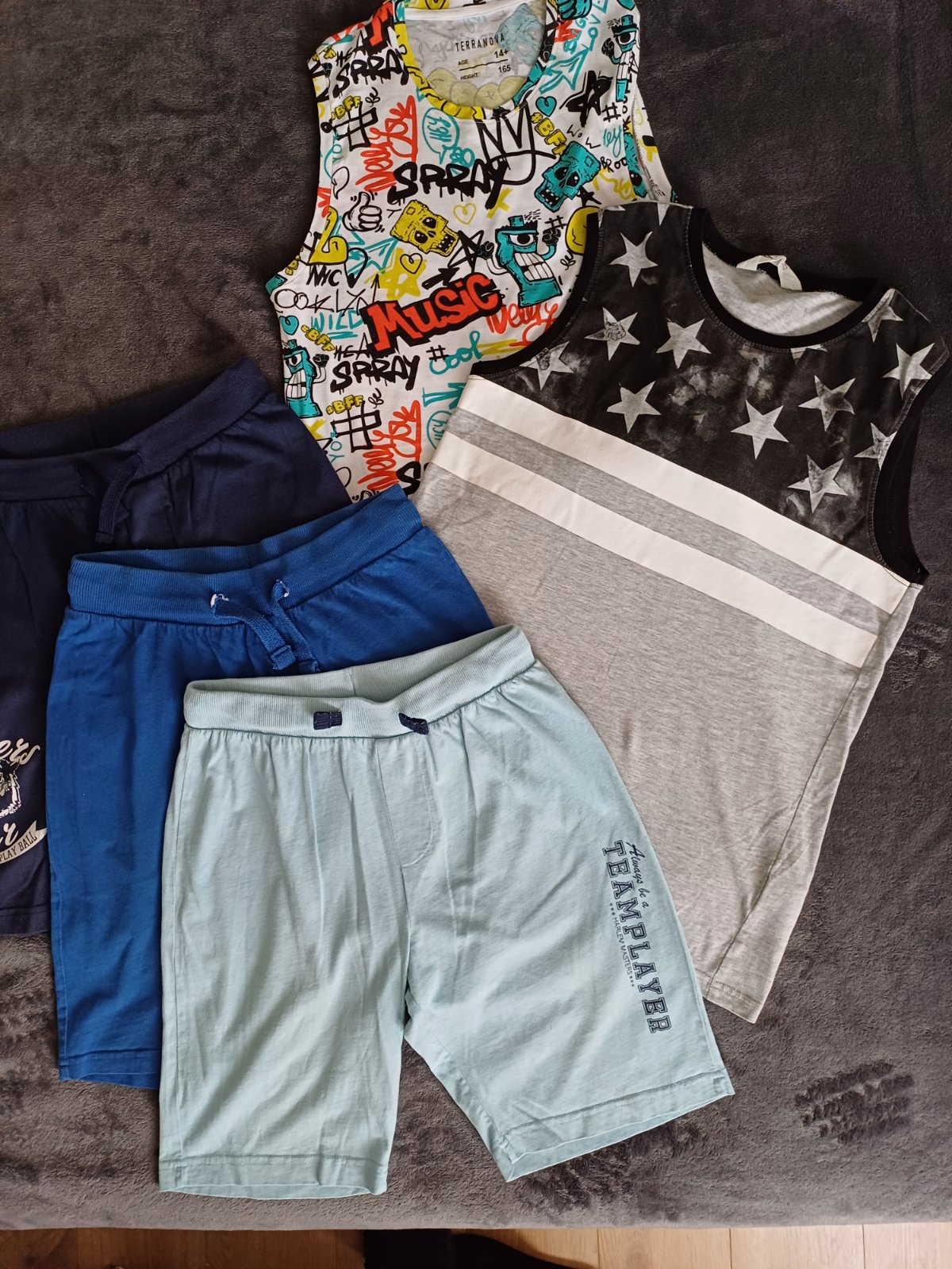 Kraťase sú veľkosti146/152 .Tielko s hviezdičkami 146/152 a farebné tielko 14+ je nové.
