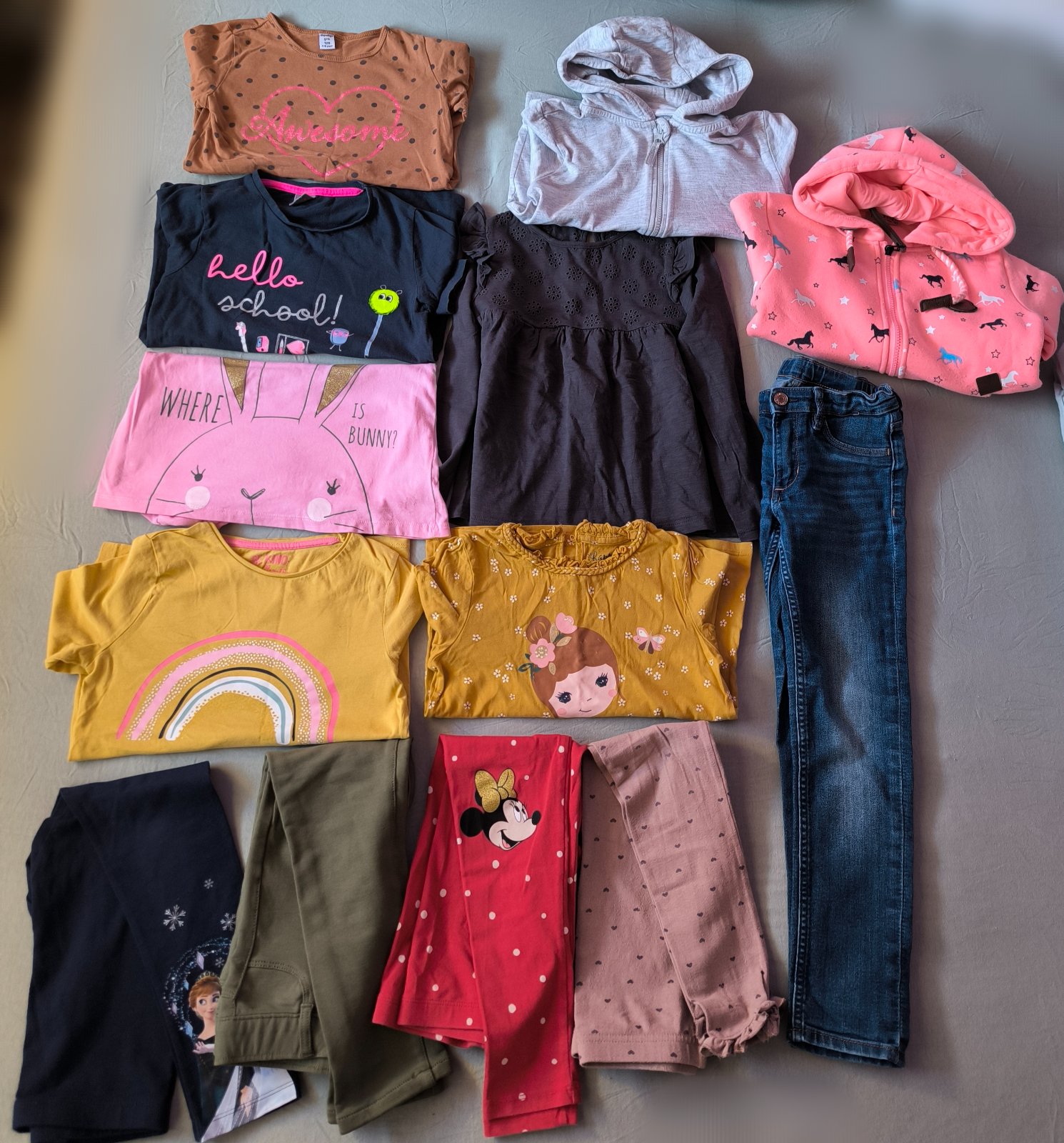 Uplne nove Zelene H&M, 8€ Modre Mickey Mouse 10€ Zlte sinsay 5€ Rifle a jednorozcom mam 2 velkosti, 138 a 140,kus 5€ Ruzove jednorozec lupilu 122/128,5€ Tmavoruzove HM,5€ Teplaky Sinsay 3€ Spolu: 43€