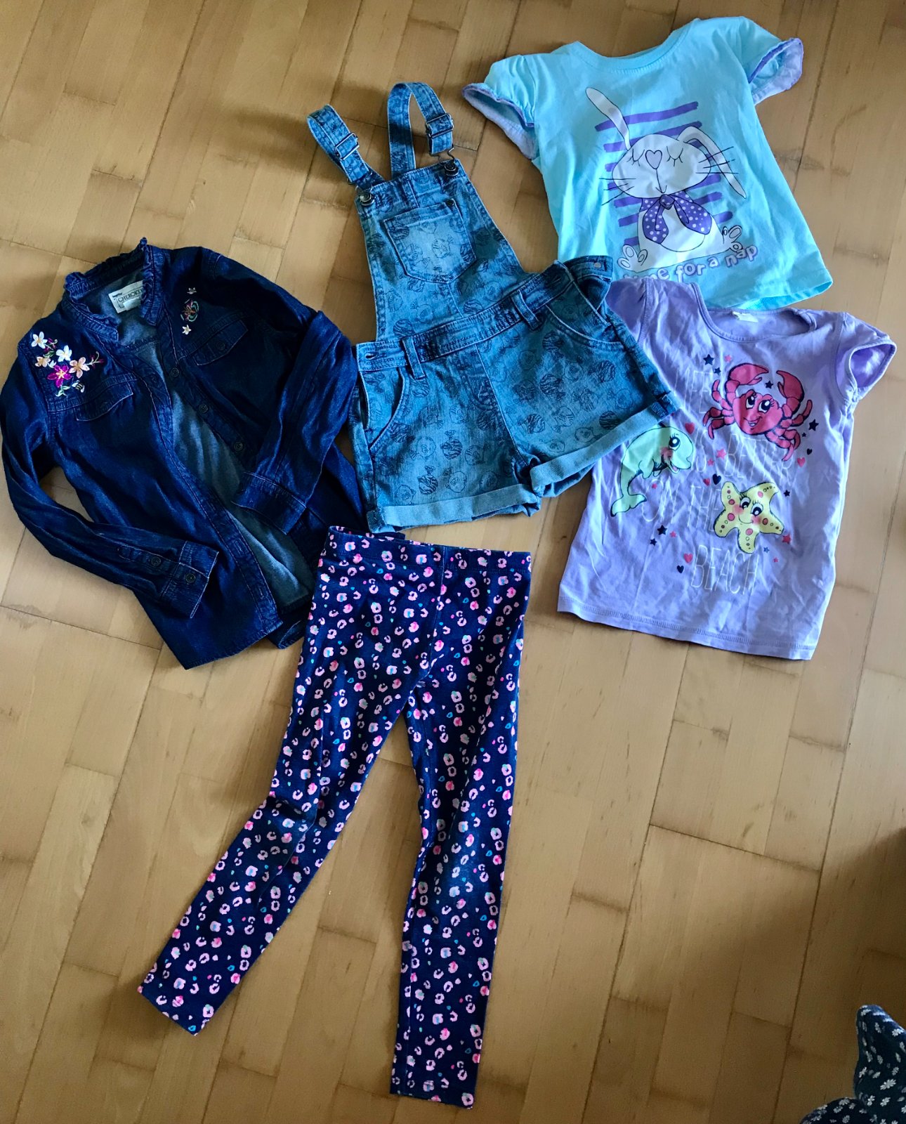 Ponukam balíček oblečenia velkosť 116 , riflové kratase, riflová košela, legíny, trička v dobrom nosenom stave