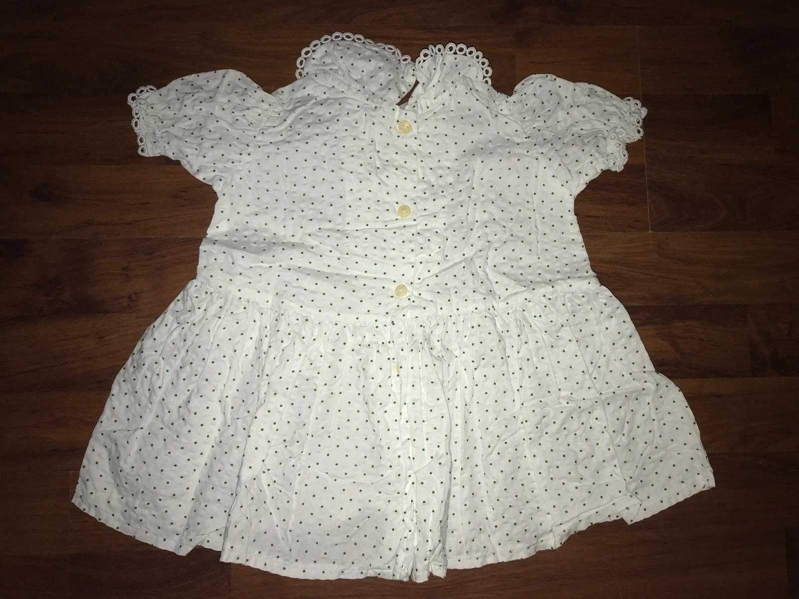 -snehobiele šaty s jemnými zelenými bodkami- s čipkou okolo krku a rukávkov, bavlnené - dĺžka 47 cm, šírka horná časť - obvod 64 cm