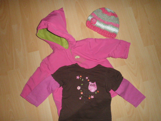 Krásna vetrovečka so šišatou kapucničkou, vo výbornom stave a v krásnej farebnej kombinácii, vrchná časť krásne jasno ružová a futro neónovej limetkovej farbe, písaná na 6 mesiacov, ale skôr väčšia, nosili sme skôr ako veľ. 74-80, kapucňa krásneho strihu, doložím čiapočku-pumpkin patch, ktorú sme nosili zároveň a farebne ladí :). Rozmery vetrovky: rukáv 25 cm /meraný horný rozmer, samotný rukáv/, celková dĺžka 36,5 cm /merané bez kapucne/. Tričko Fisher Price, super stav.