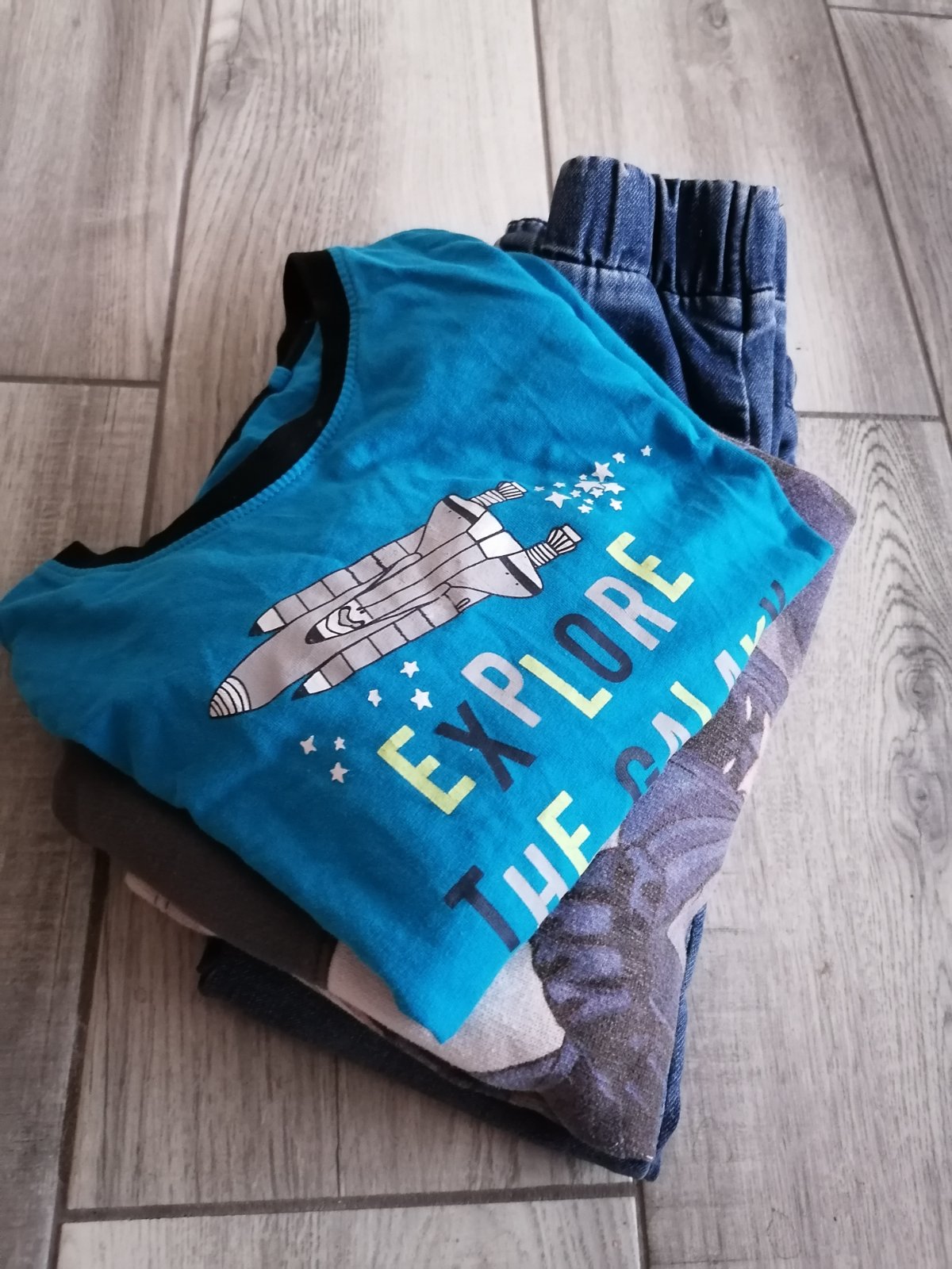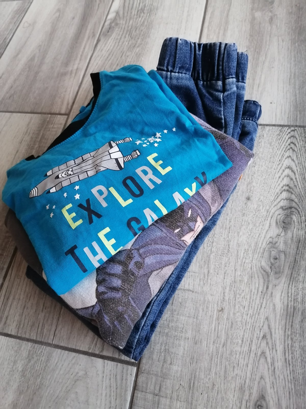 Tričko a rifle sú ako nové. Rifle sú super mäkká riflovina, pohodlné. Mikina Batman nosená viac, možno pre nenáročných alebo na doma, už podľa uváženia