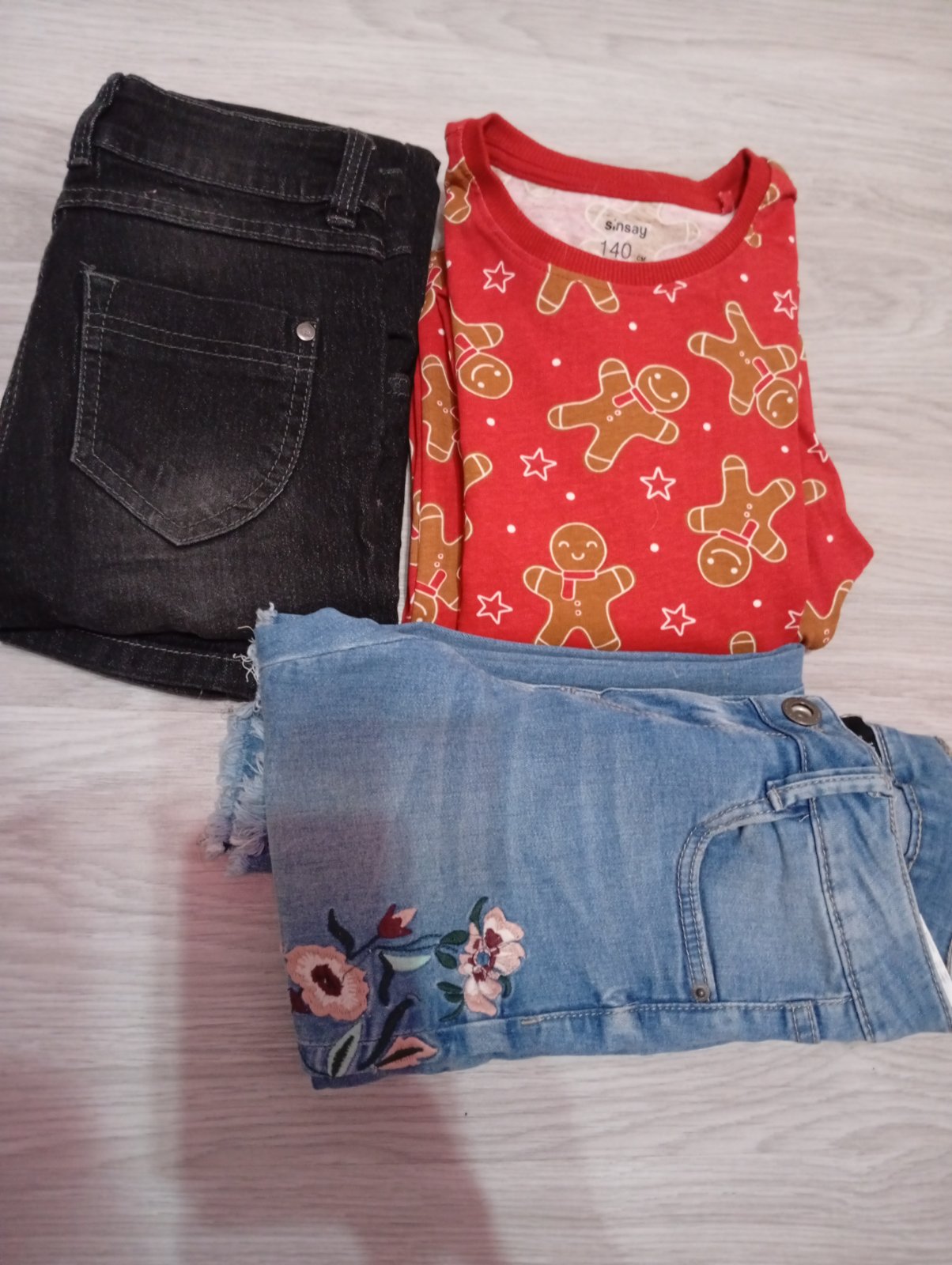 Pyžamko je úplne nové, nenosené, len vyskúšané ( netrafili sme veľkosť), rifle nosené ale úplne v perfektnom stave. Spolu 10€