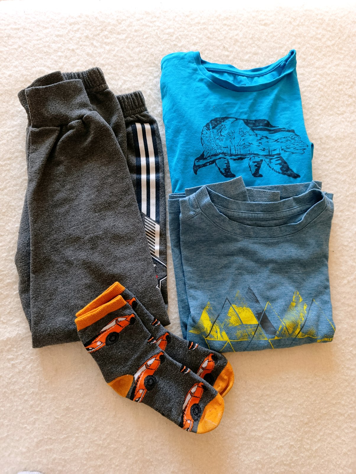 Tričká dlhý rukáv, tepláky, ponožky, všetko pekný stav, cena spolu