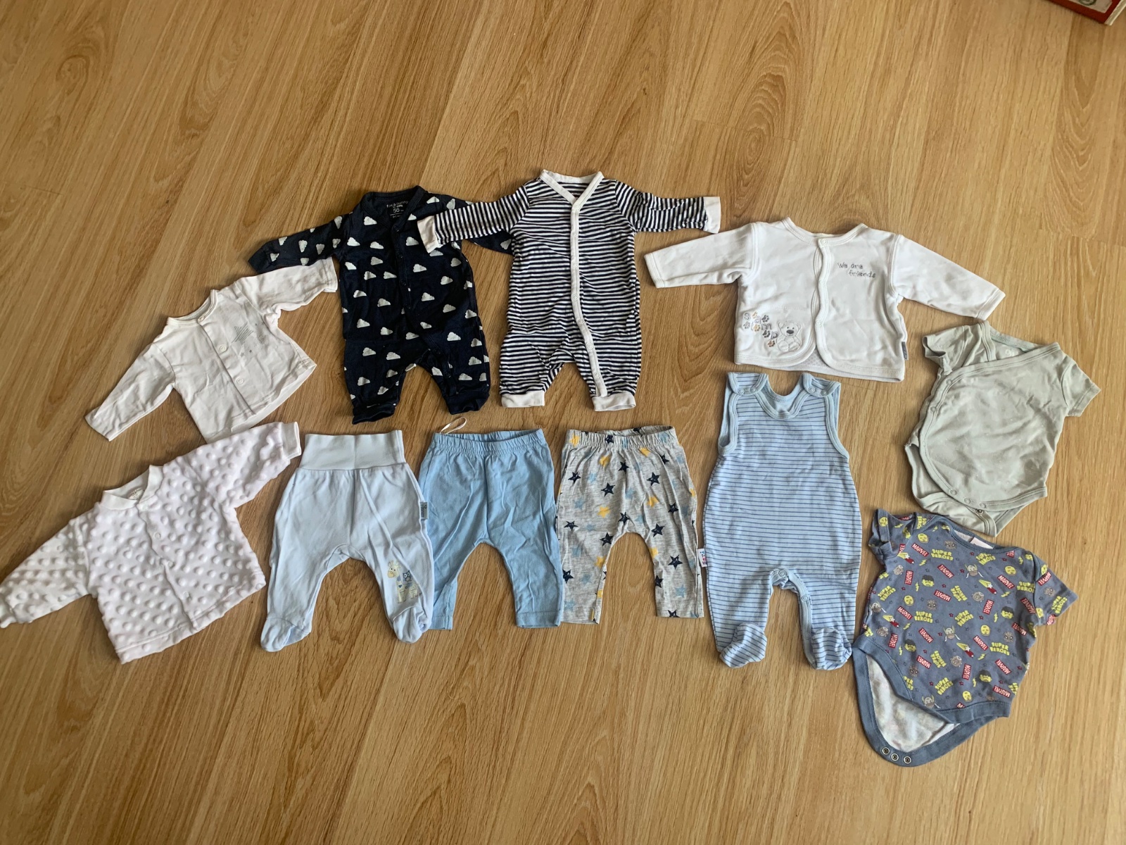 4 ks tepláčikov, 2ks tričká dlhý rukáv,1ks nohavice na tráky, 1ks body dlhý rukáv, 1ks tenšia mikina(skôr tričko s kapucňou),1ks tričko krátky rukáv, 1 overal, 1 flisove dupačky s kabátikom,súprava...