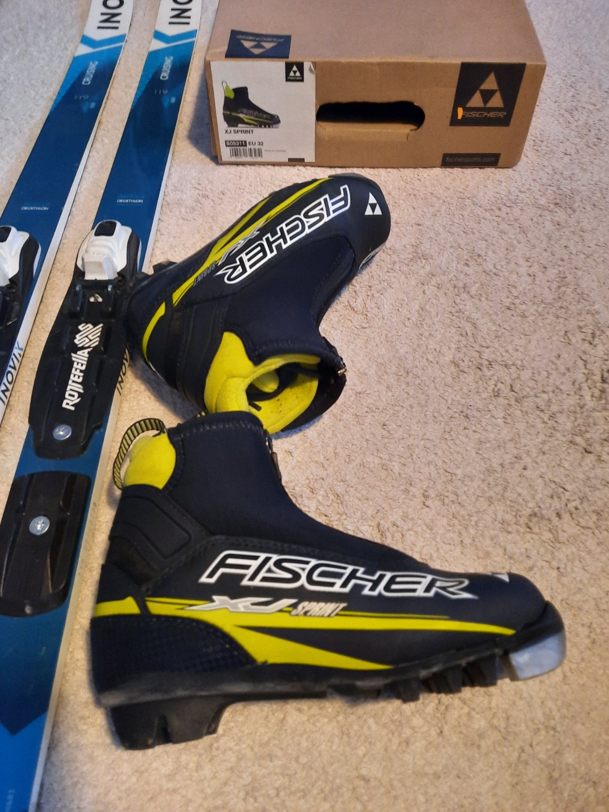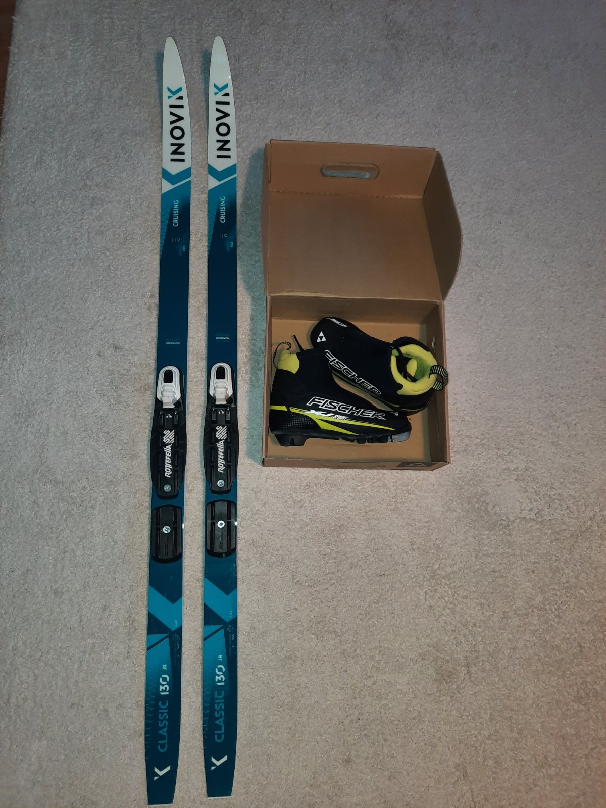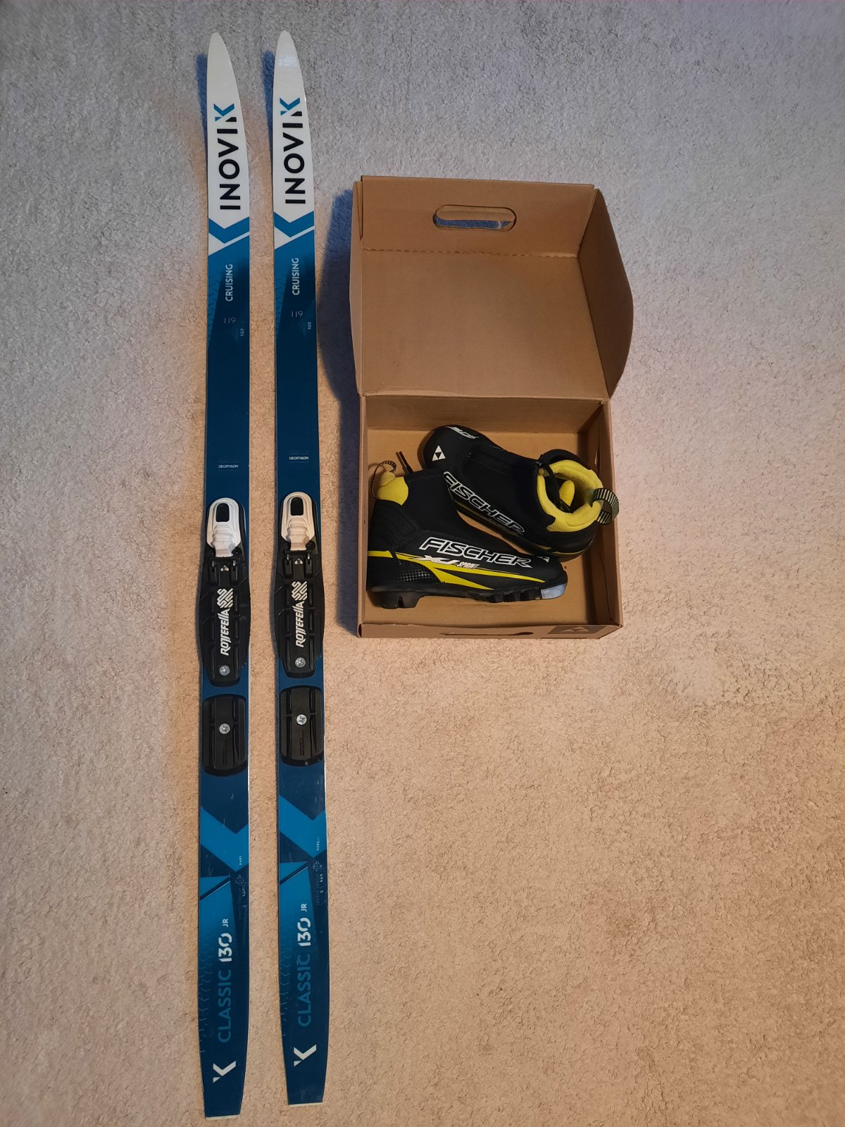 Bežky značka Inovik 130 jr, dĺžka 119cm, topánky Fischer veľ. 32. V TOP stave, nepoškodené.