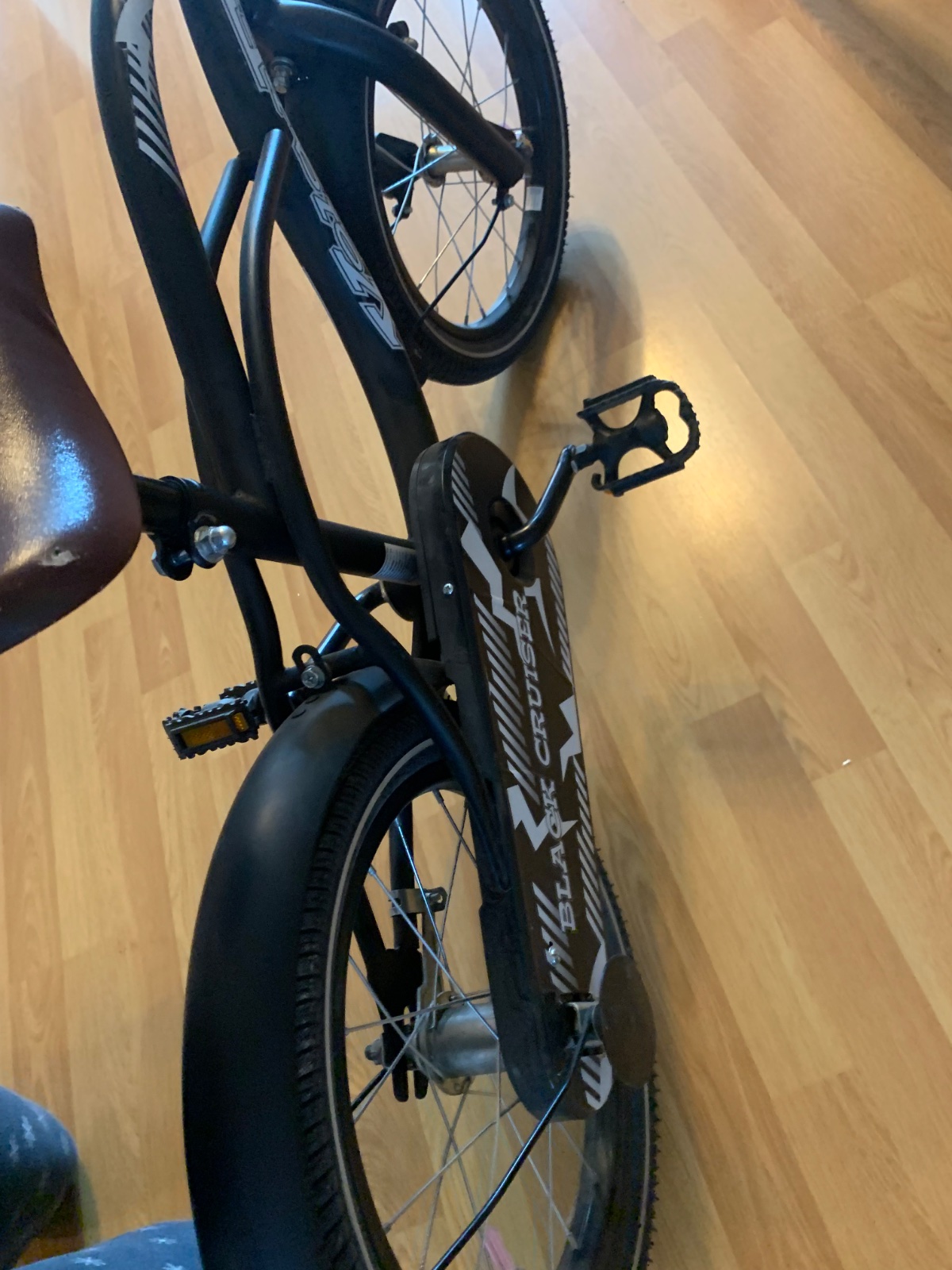 Detsky bicykel Volare Black Cruiser. Pouzivamy no stale v dobrom stave. Najvacsie poskodenie vidno na sedanke, vid foto, ako sa padalo, sedanka to odniesla najviac. A na riadidlach gumene rucky z boku maju diery. Dcera chcela strapce.