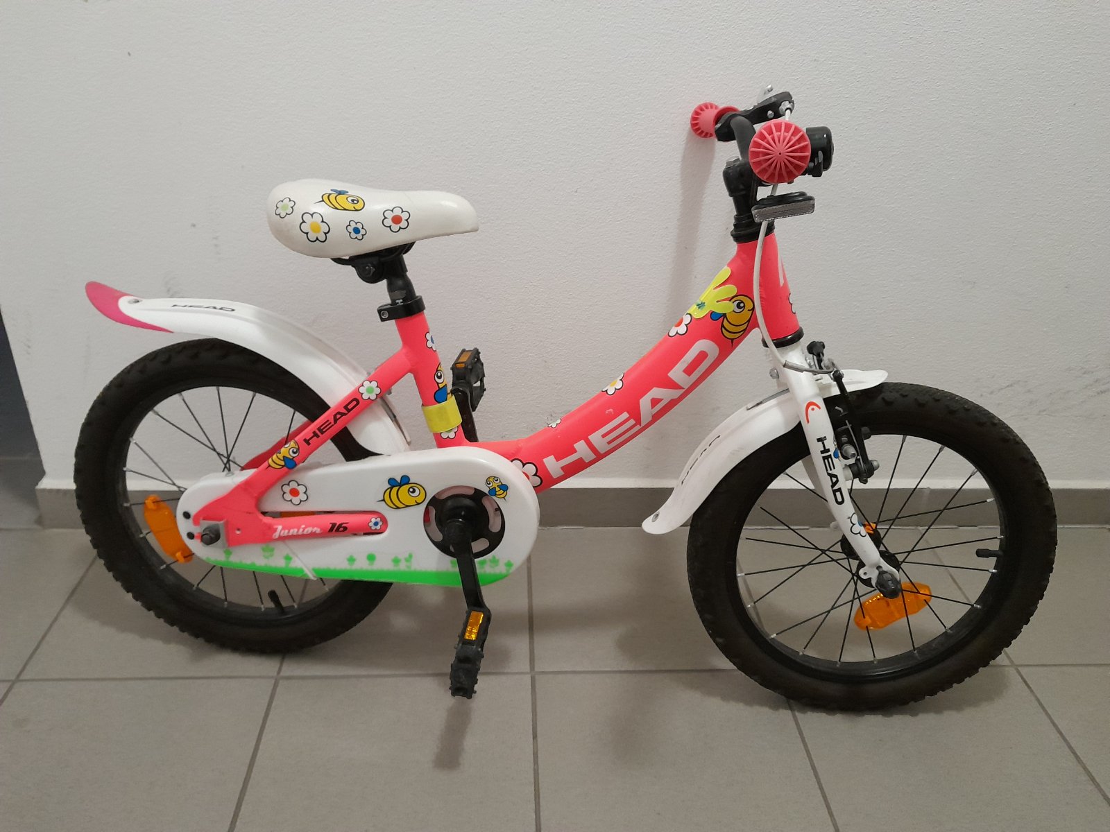 Predám ružový bicykel značky Head, veľkosť kolies 16, má hliníkový rám, pre dieťa 4-6 rokov, hmotnosť 8,9 kg.