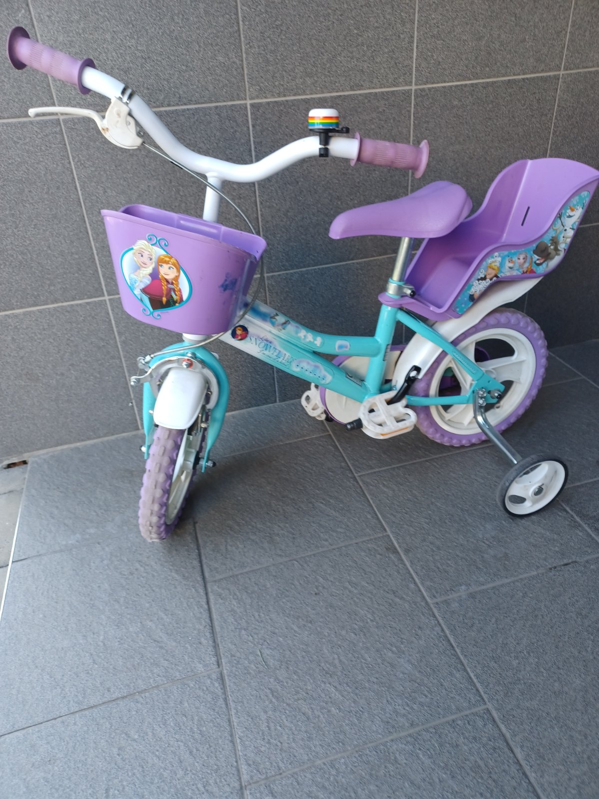 Bicykel s pomocnymi kolieskami, vhodný pre malé slečny, jeden pedál je odmontovany (viď foto),