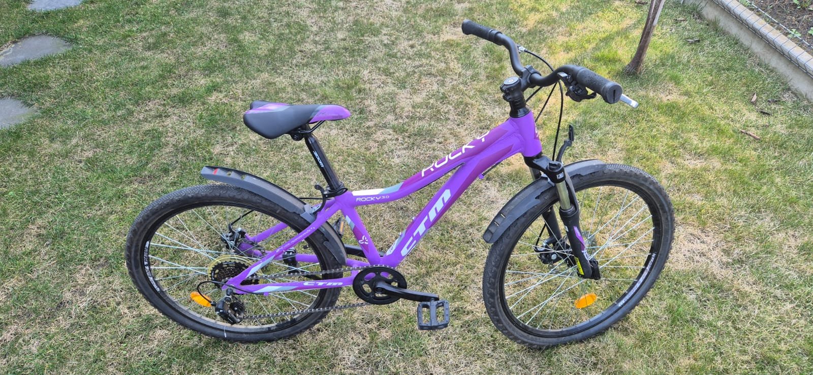 Predám detský bicykel CTM Rocky 3.0 vo veľmi dobrom stave po 1 dieťati. Používaný bol iba jednu sezónu a je bez vád, má len znamky bežného používania. Ide o detský bicykel s 24" kolesami, vhodný pre deti vysoké 125 až 145 cm. Je vybavený hliníkovým rámom, odpruženou prednou vidlicou, mechanickými kotúčovými brzdami a komponentmi Shimano s prevodmi 1x7. Predný, zadný blatník a stojan sú v cene. Výlučne osobný odber Pezinok.