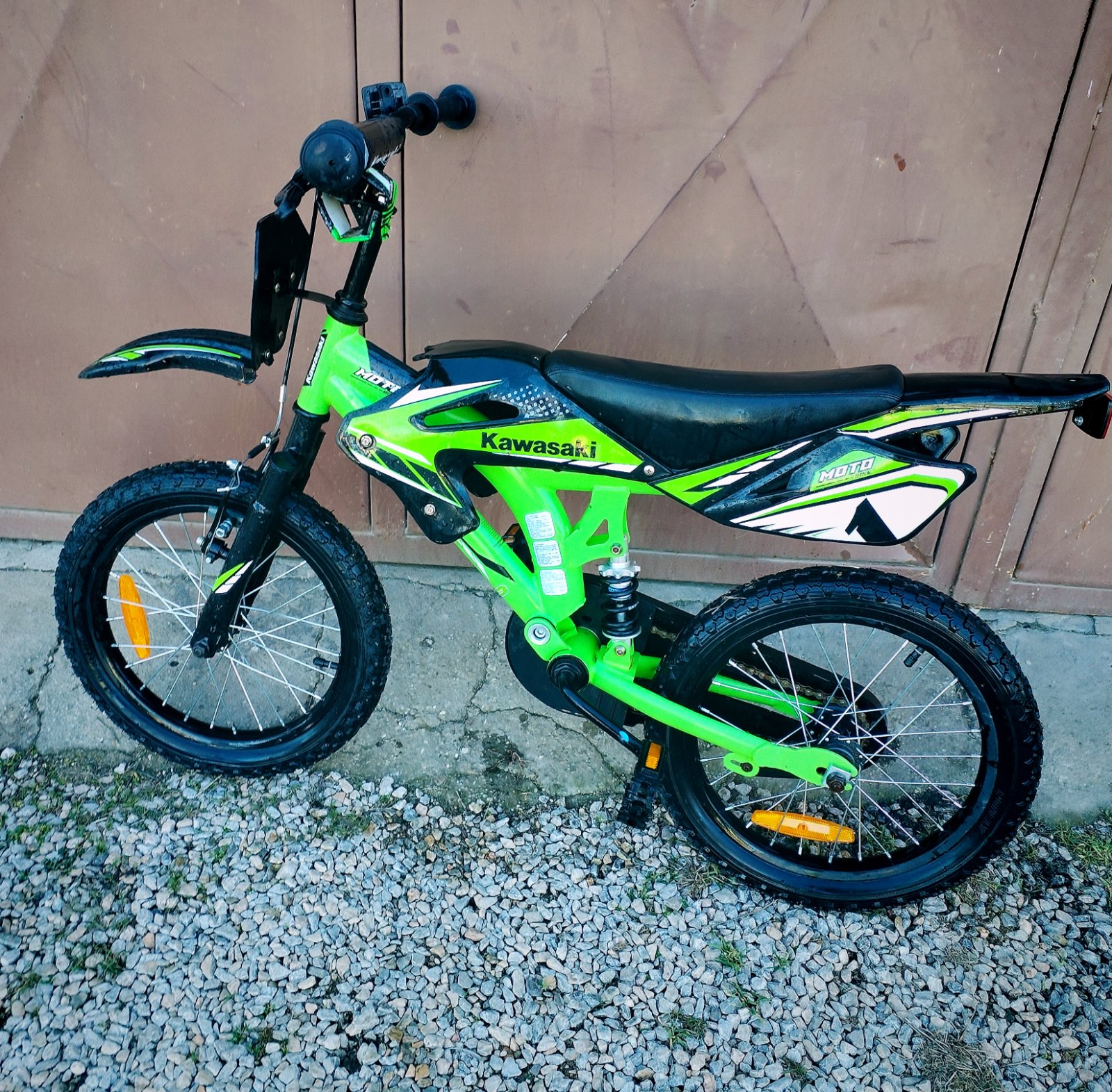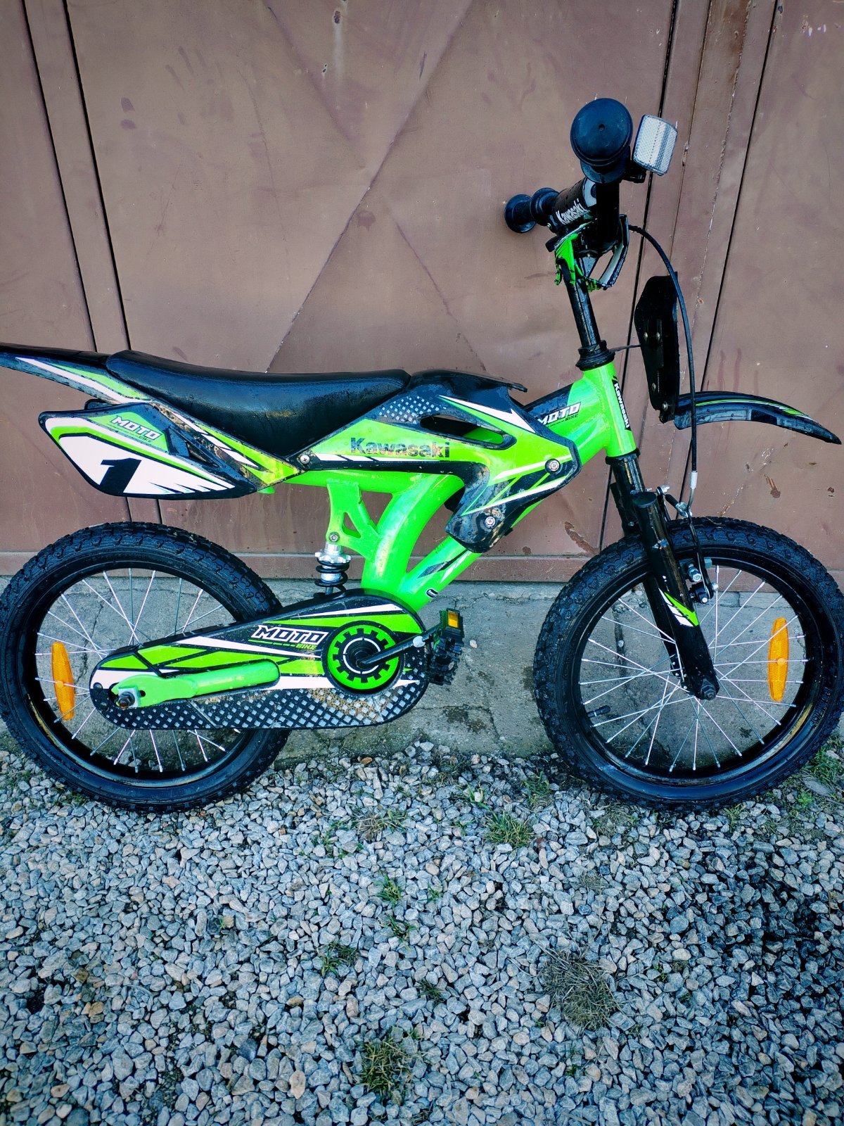 Pekný bicykel neonovy. Farba krikľavo zelená, so stojanom aj pomocnými kolieskami. Kupovaný nový v Sportisime, používaný 2 roky. Pekný stav