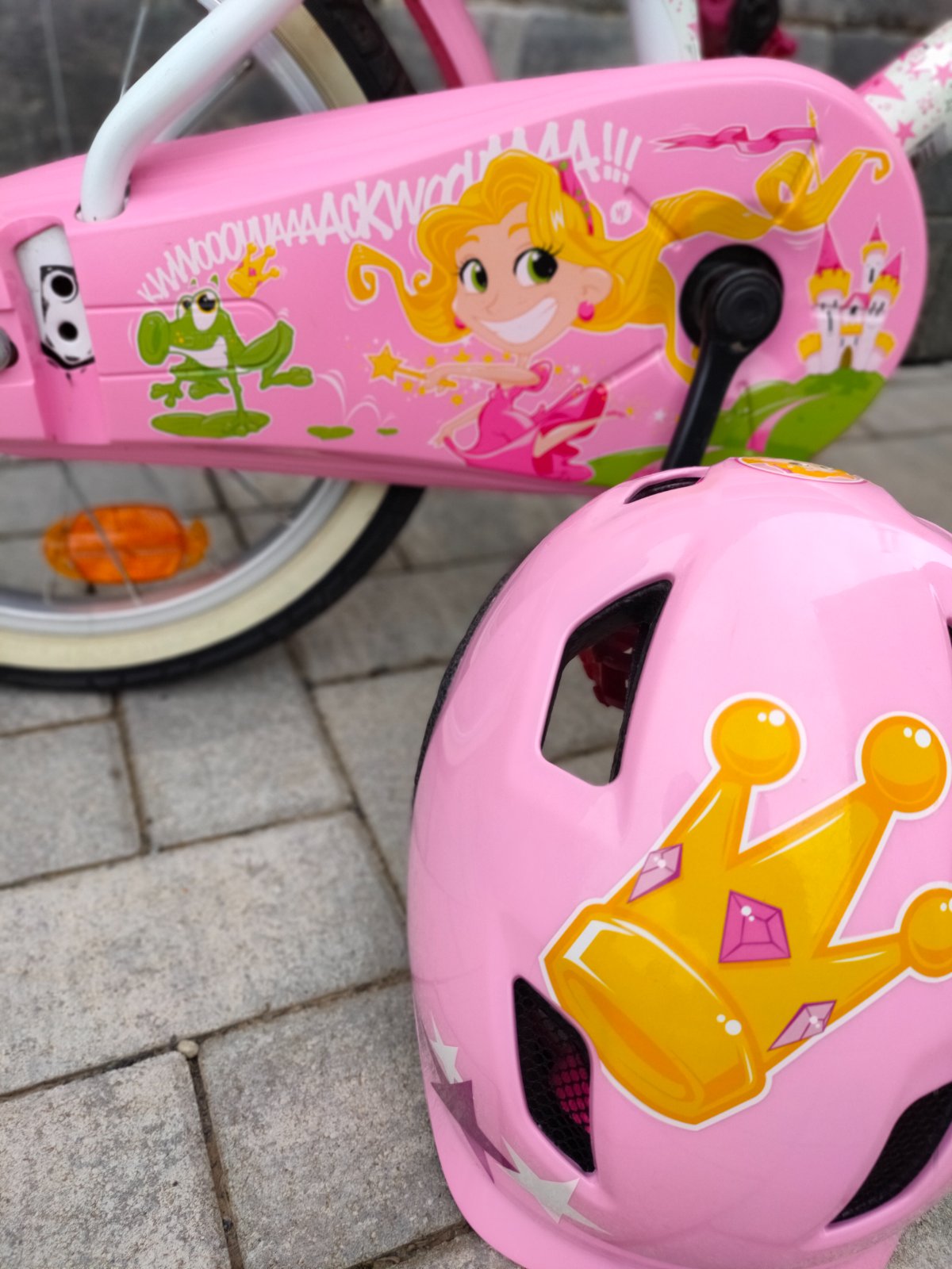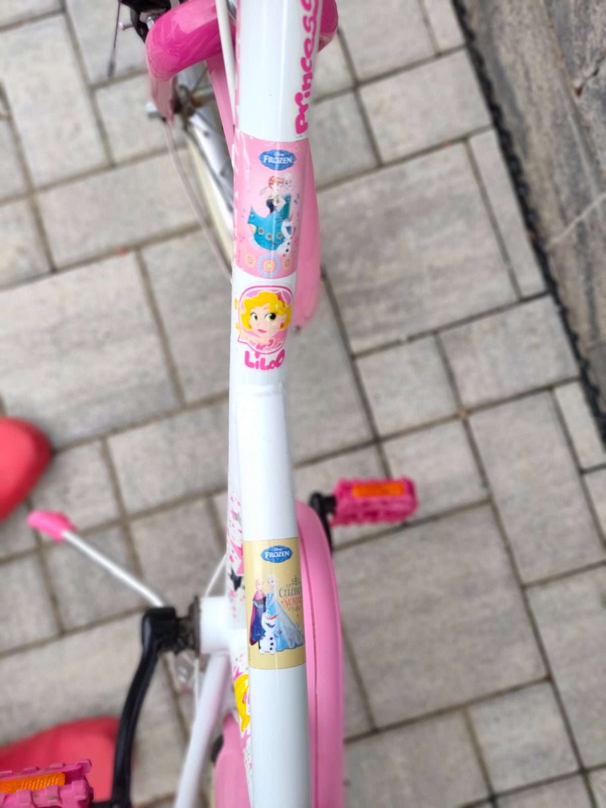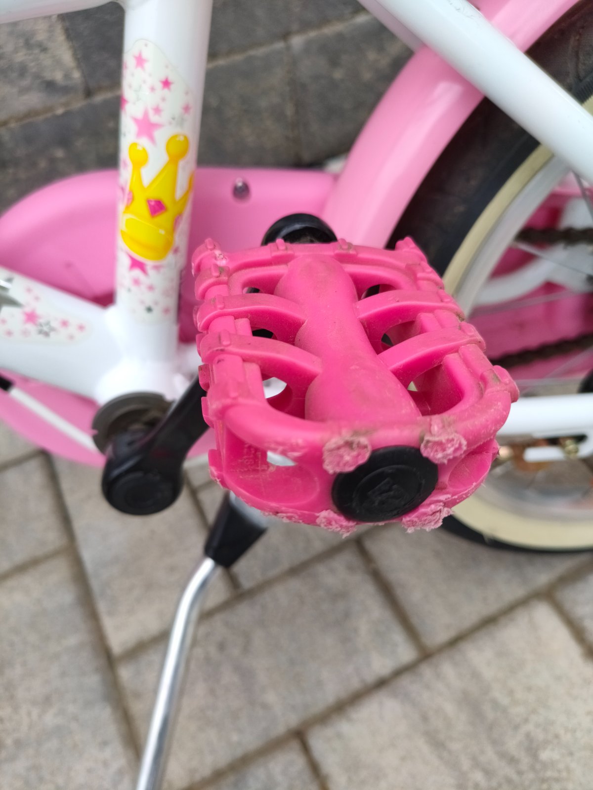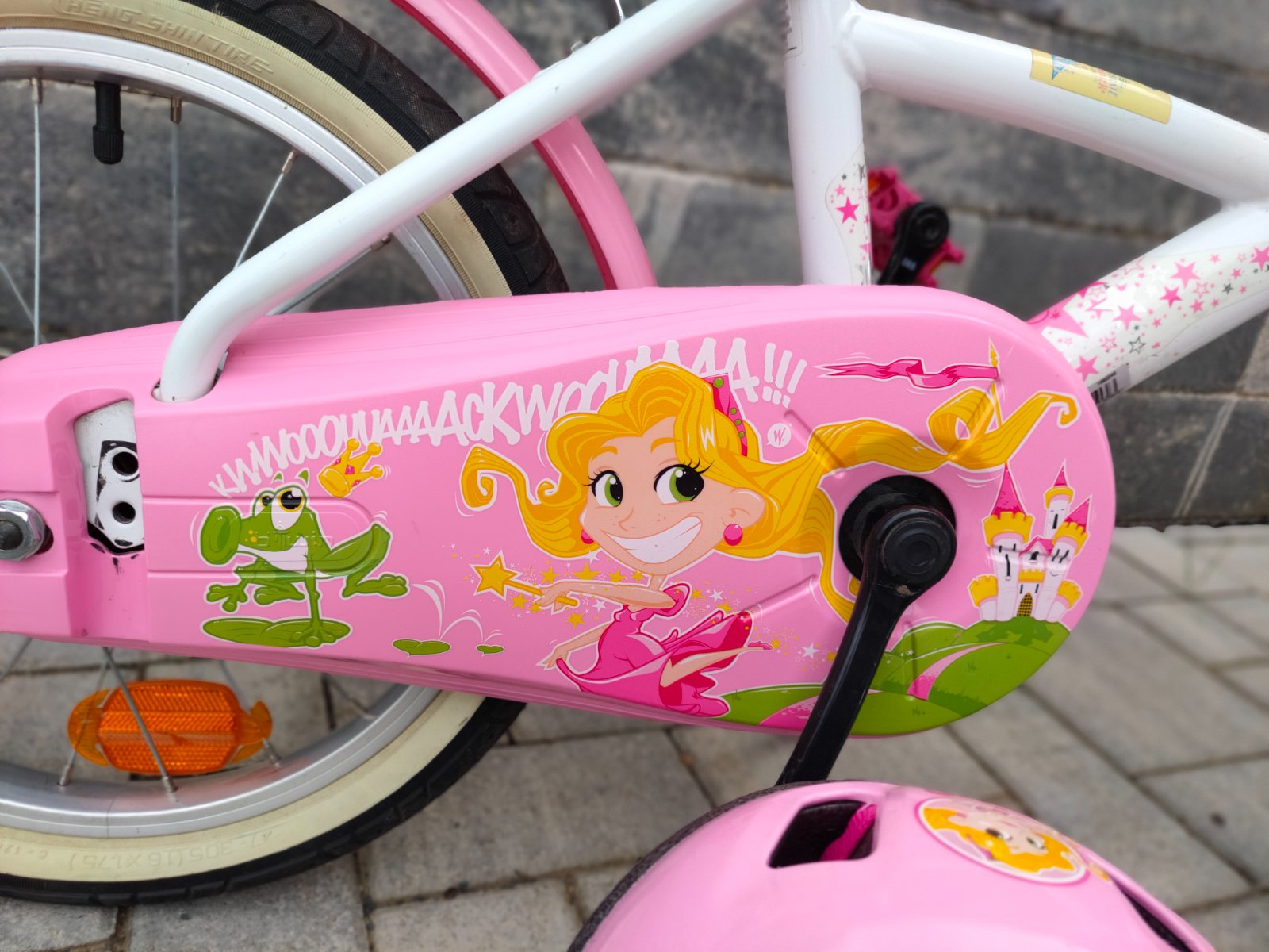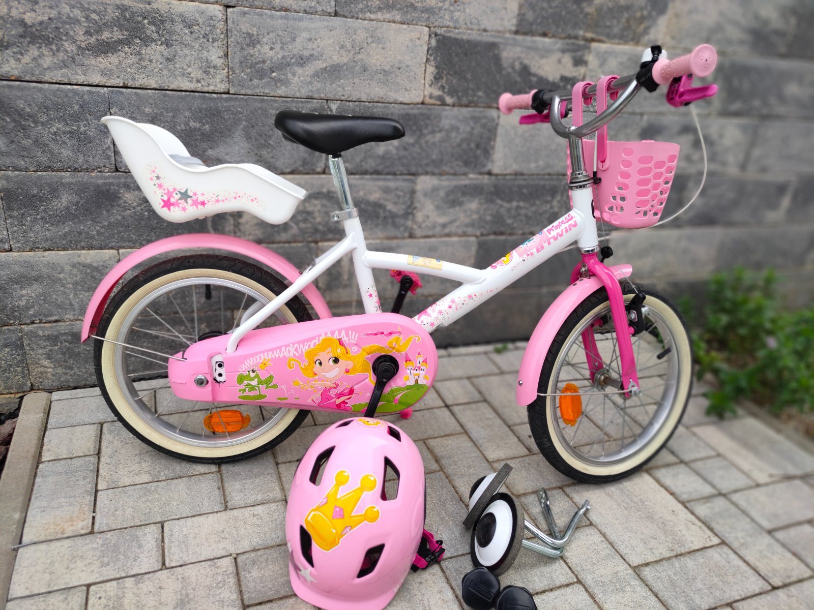 Ponúkam na predaj bicykel v dobrom stave zn. B-Twin, zakúpený v Decathlone. Používanie vidno hlavne na pedáloch a jednej brzde (posledné fotky) a má aj zopár škrabacov. Vhodný pre dievčatá od 4-6 rokov (105-130cm). K bicyklu pridávam pomocné kolesá, prilbu Princess, košíček na riadidlá pre hračky, nosič pre bábiky, stojan a zvonček.