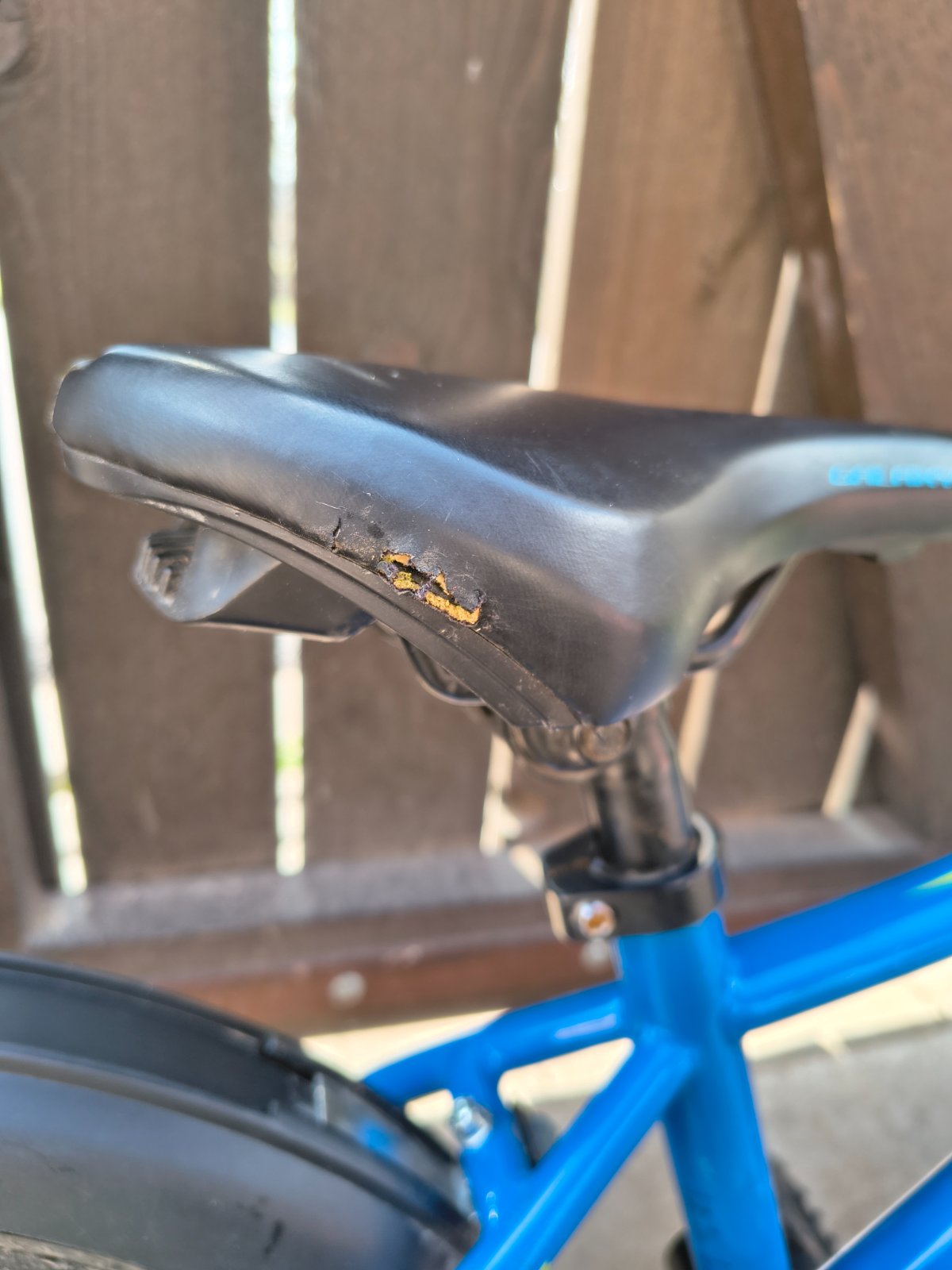 Používaný starší bicykel s modrými kolesami. Má dva košíky, kvalitnú kostru, sedadlo ok, brzdy ok. Len reťaz je hrdzavál. Je potrebné dofúkať gumy. Bez predného košíka.