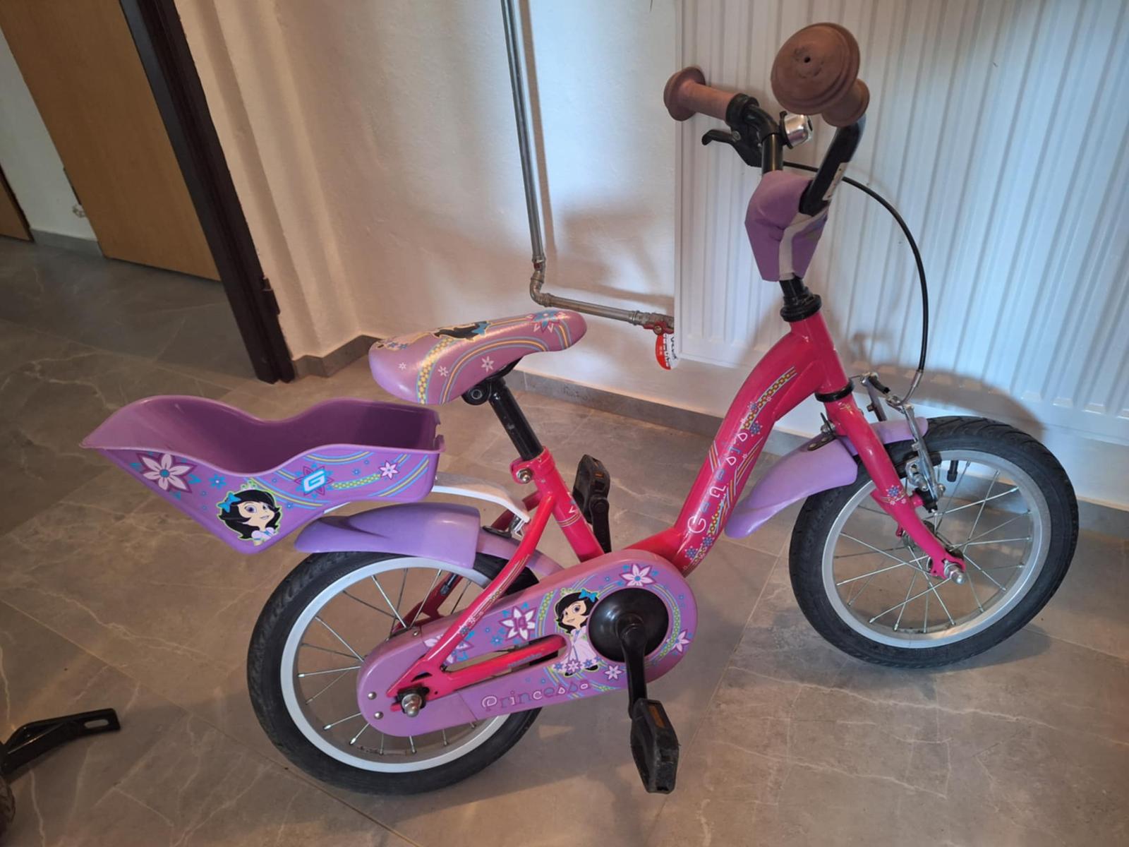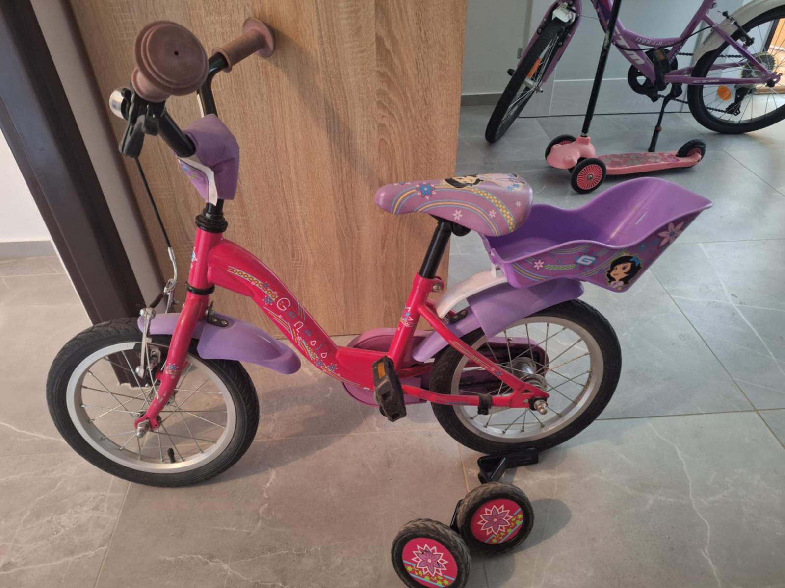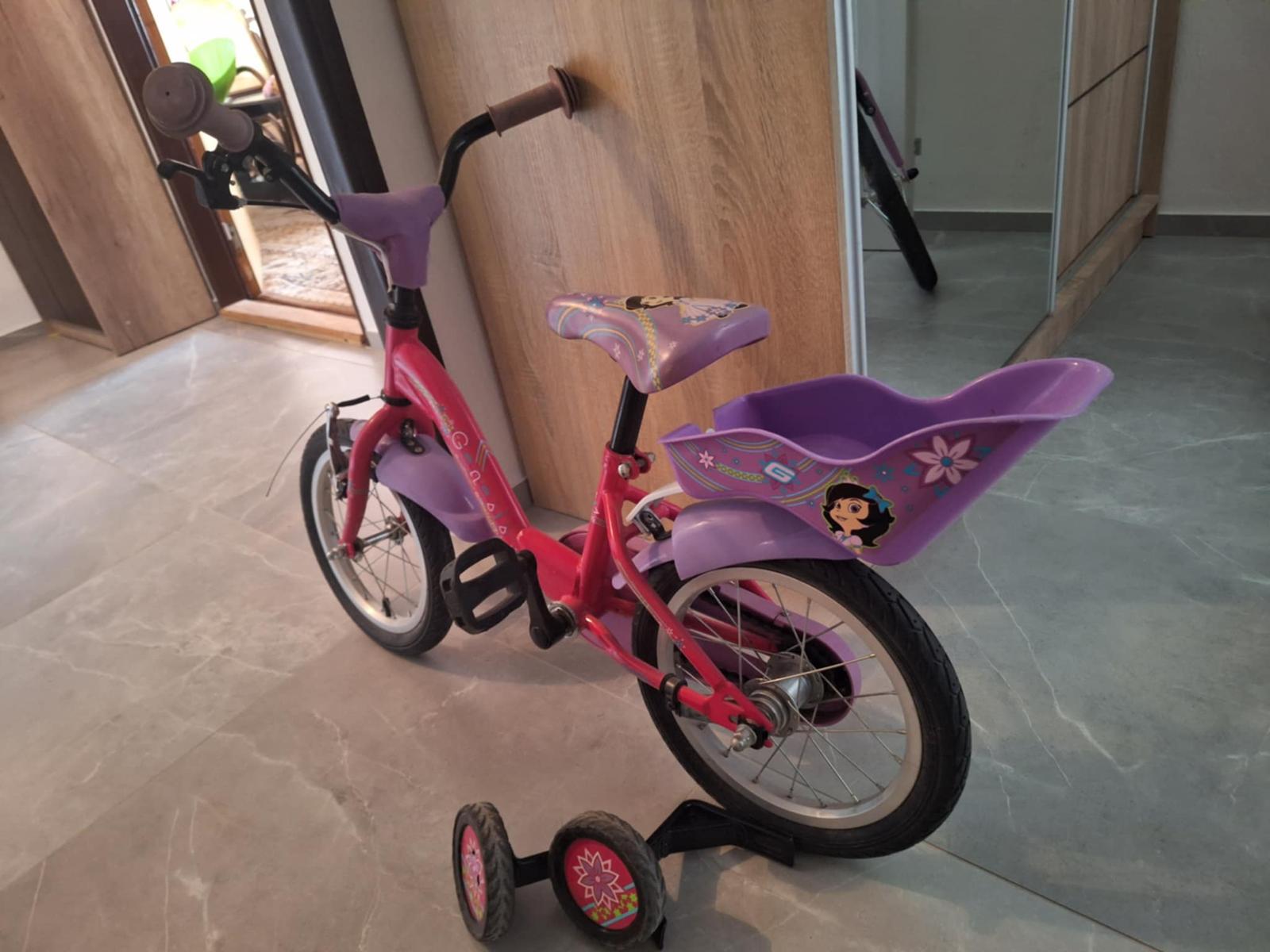 Ponúkam na predaj používaný ale zachovalý dievčenský bicykel so 14 palcovými kolesami. Vzadu nosič pre bábiky. Súčasťou sú odnímateľné pomocné kolieska a tyč na držanie stability.