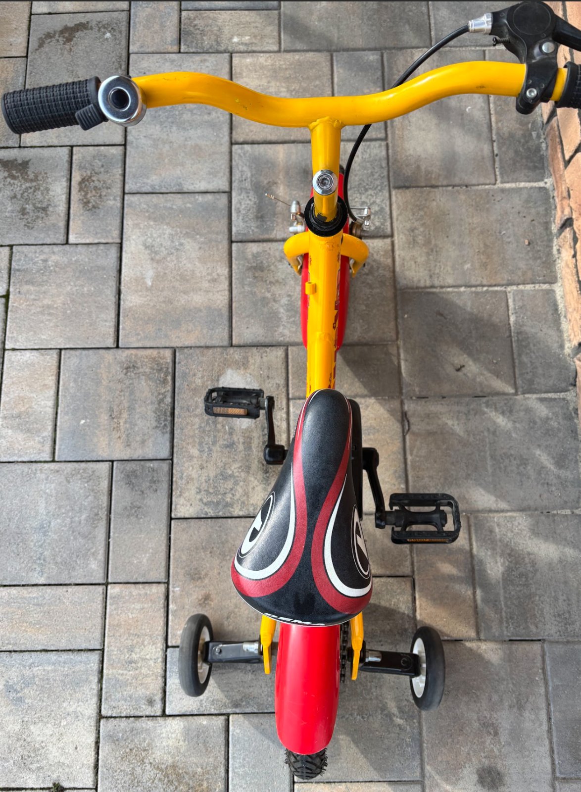 Bicykel používaný jedným dieťaťom (nami kupovaný). Používaný bez pomocných koliesok, bežné známky použitia (oderky).