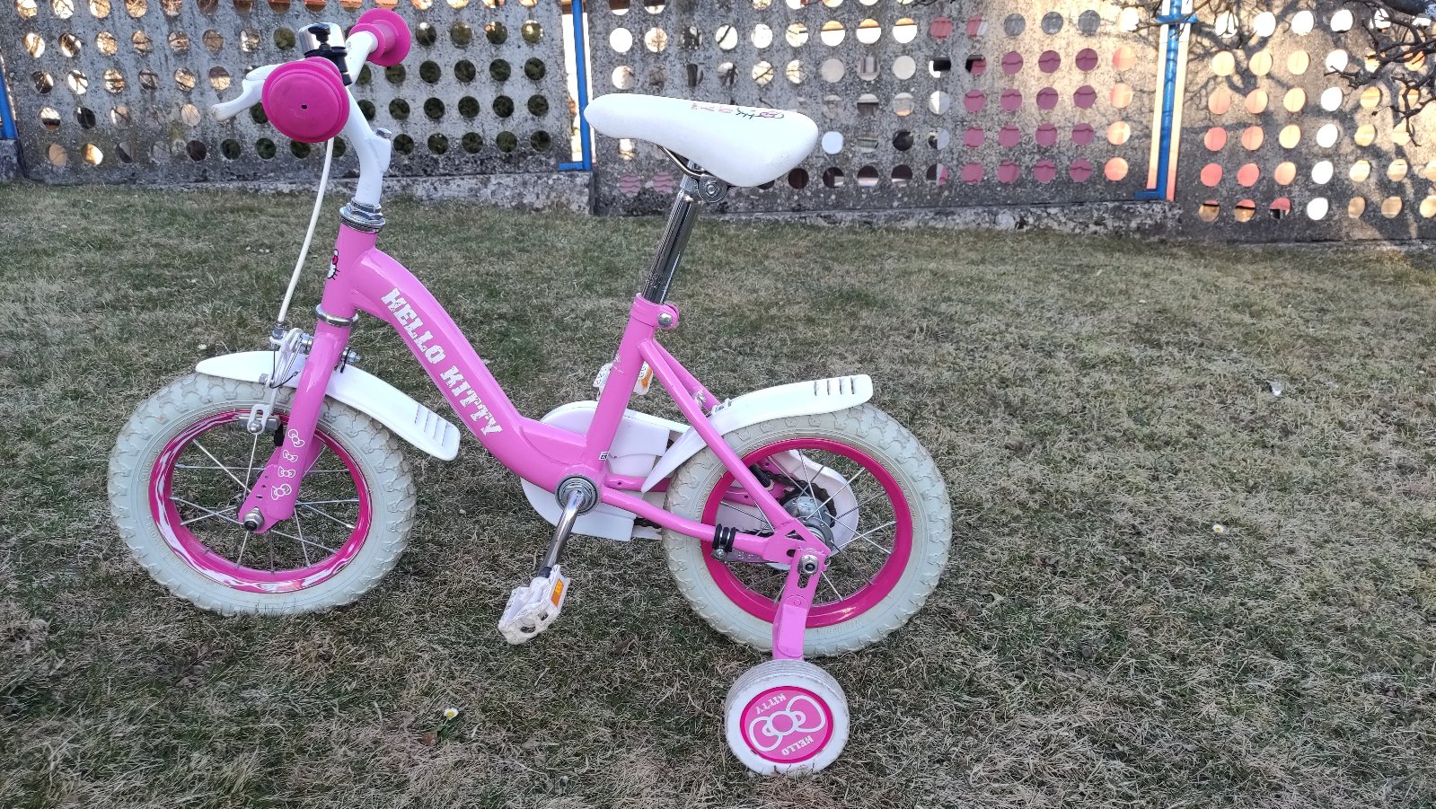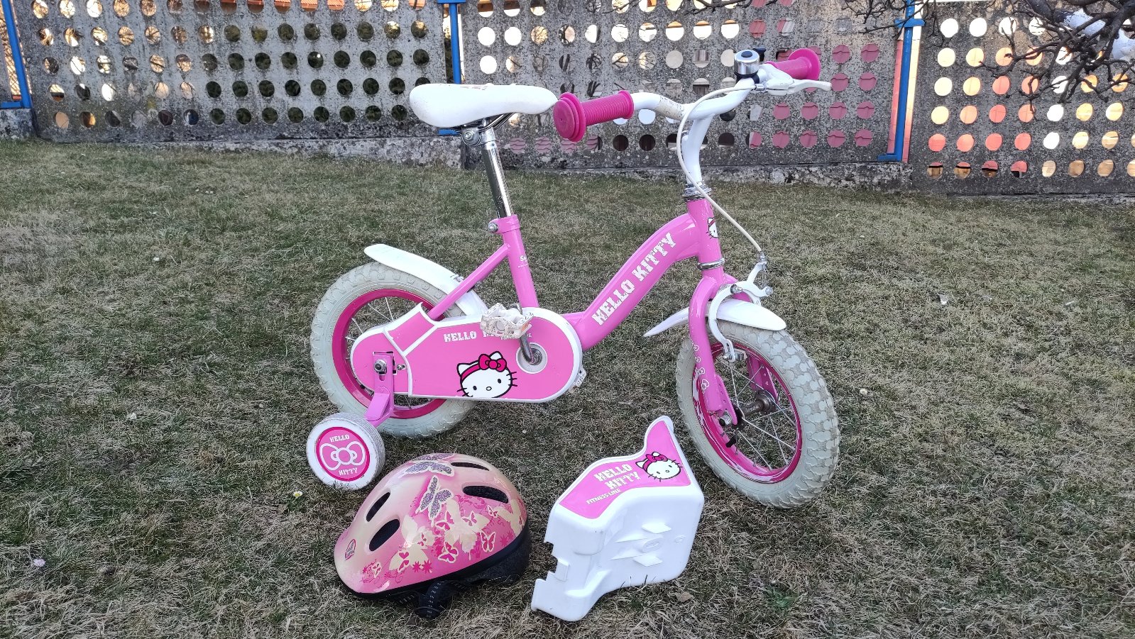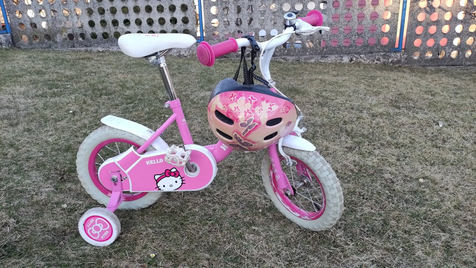 Predám bicykel Hello Kitty pre dievčatko, veľkosť kolies 12. Sedadlo je kožené. Súčasťou je aj prilba (veľkosť viď na fotke) a nosič s držiakom (nie je na fotke) pre bábiku. Osobný odber.